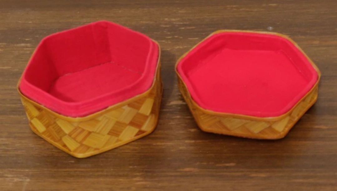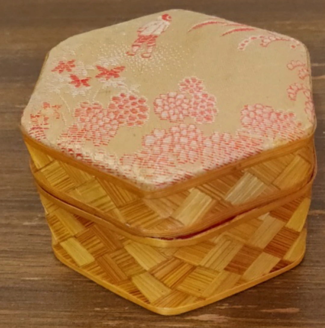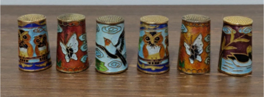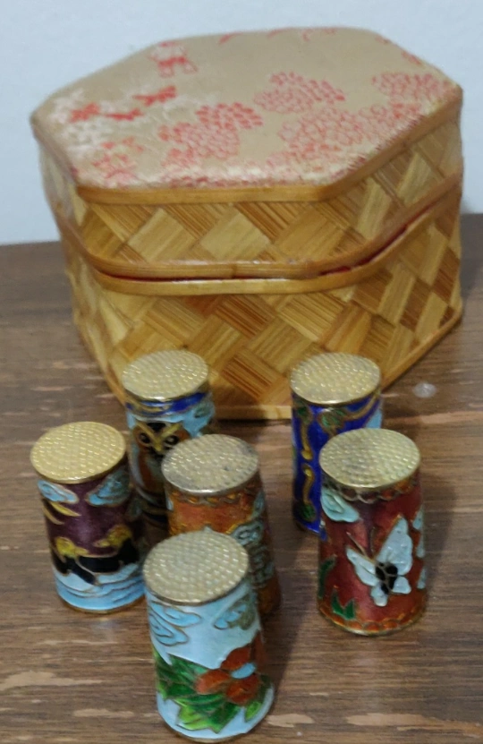 Set of six vintage cloisonné thimbles in a woven rattan box. Each thimble is hand-painted with a unique design. The box is lined with a red fabric. Comes from a smoke-free pet-free home.