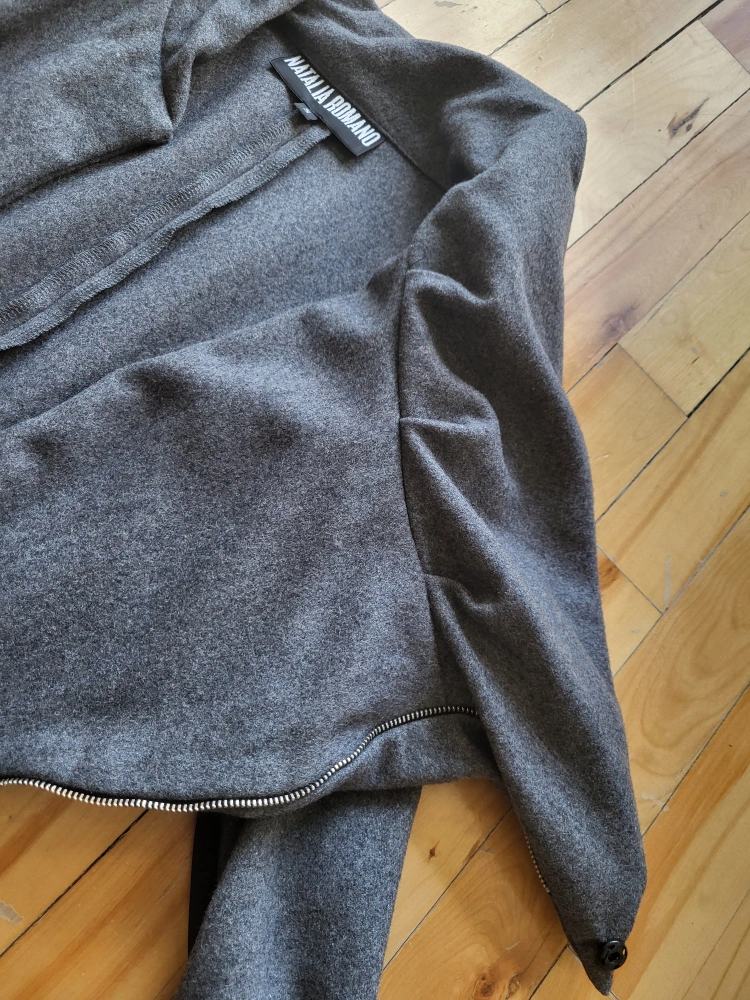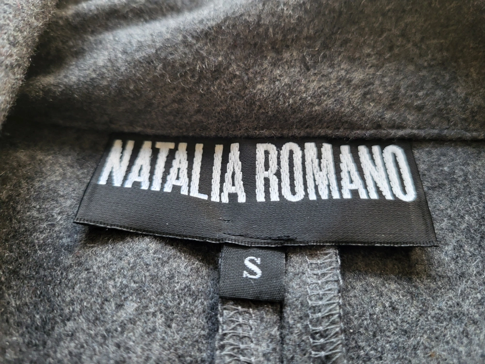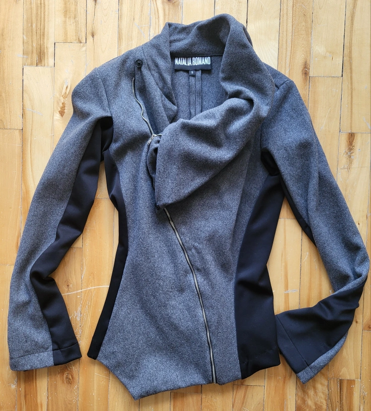 Italian Designer Natalia Romano gray cowl neck Jacket with asymmetrical zip contrast panel Size: Small 80% wool Excellent condition, hardly worn and freshly dry cleaned. Please see pictures for details. -- Pick up Downtown West End Vancouver --