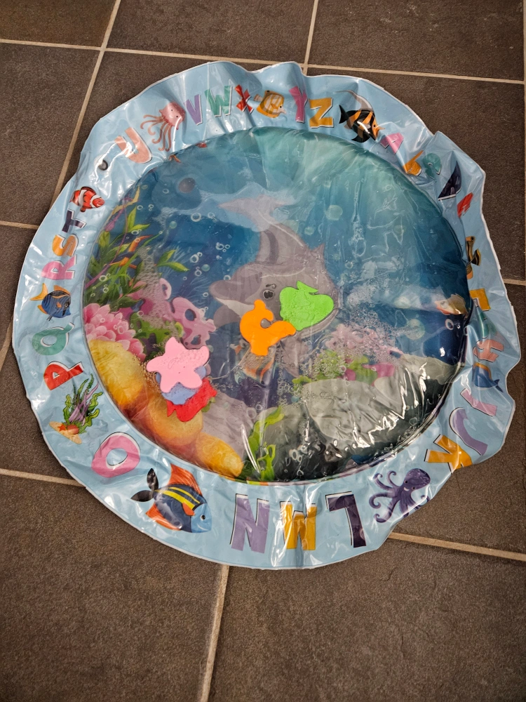 Inflatable mat with ABCs and sea creatures. Includes small toys for water play. Ideal for tummy time