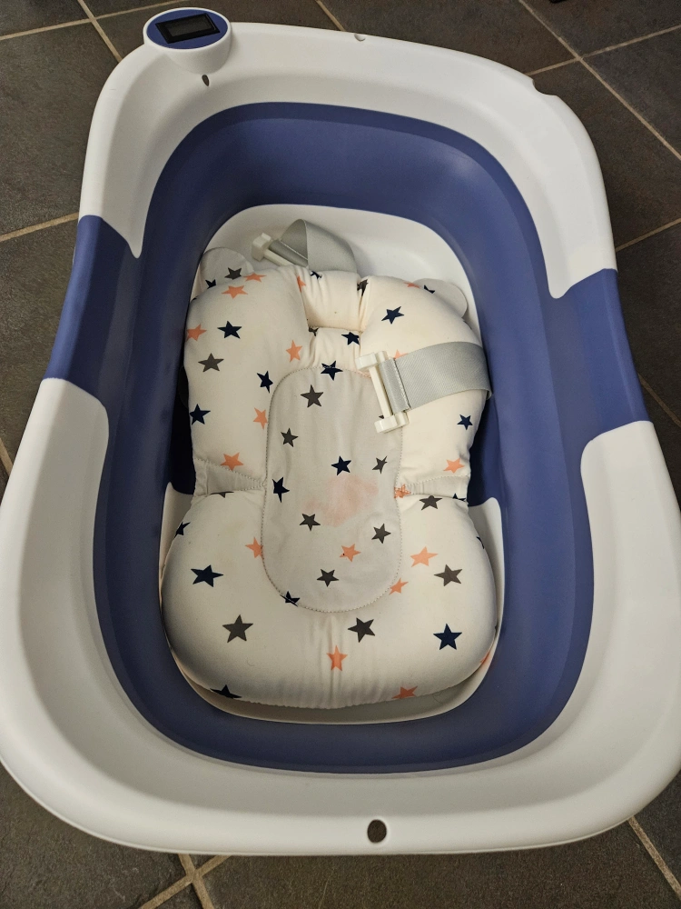 Foldable baby bath tub with a built-in thermometer. Includes a star patterned support seat for newborns.
