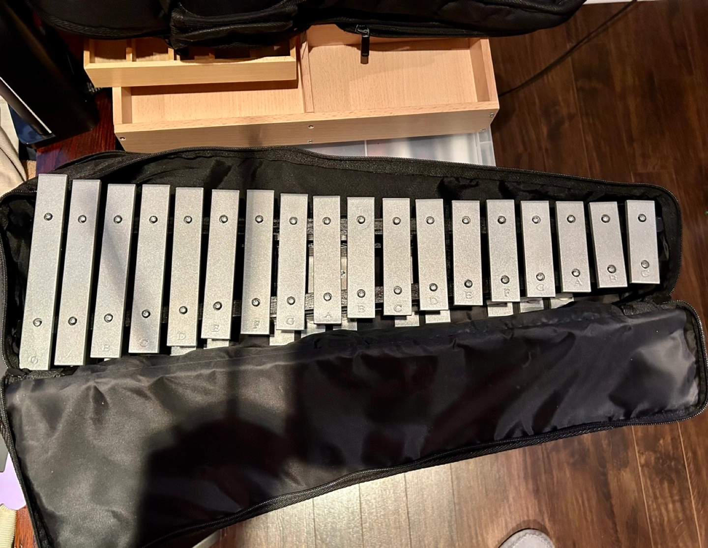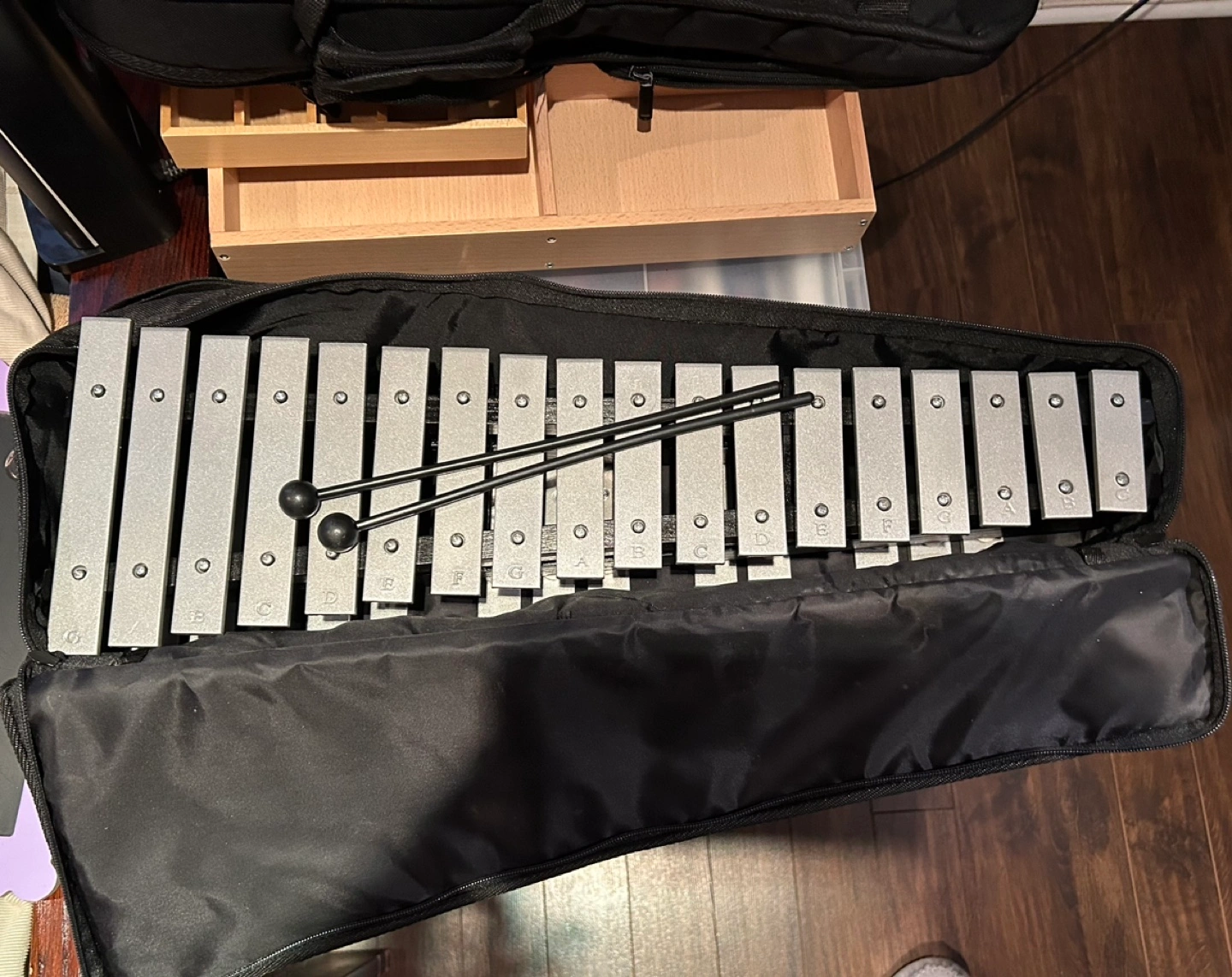 Orff instrument with carrying case and two mallets. Includes 15 bars on one side and several on other side.