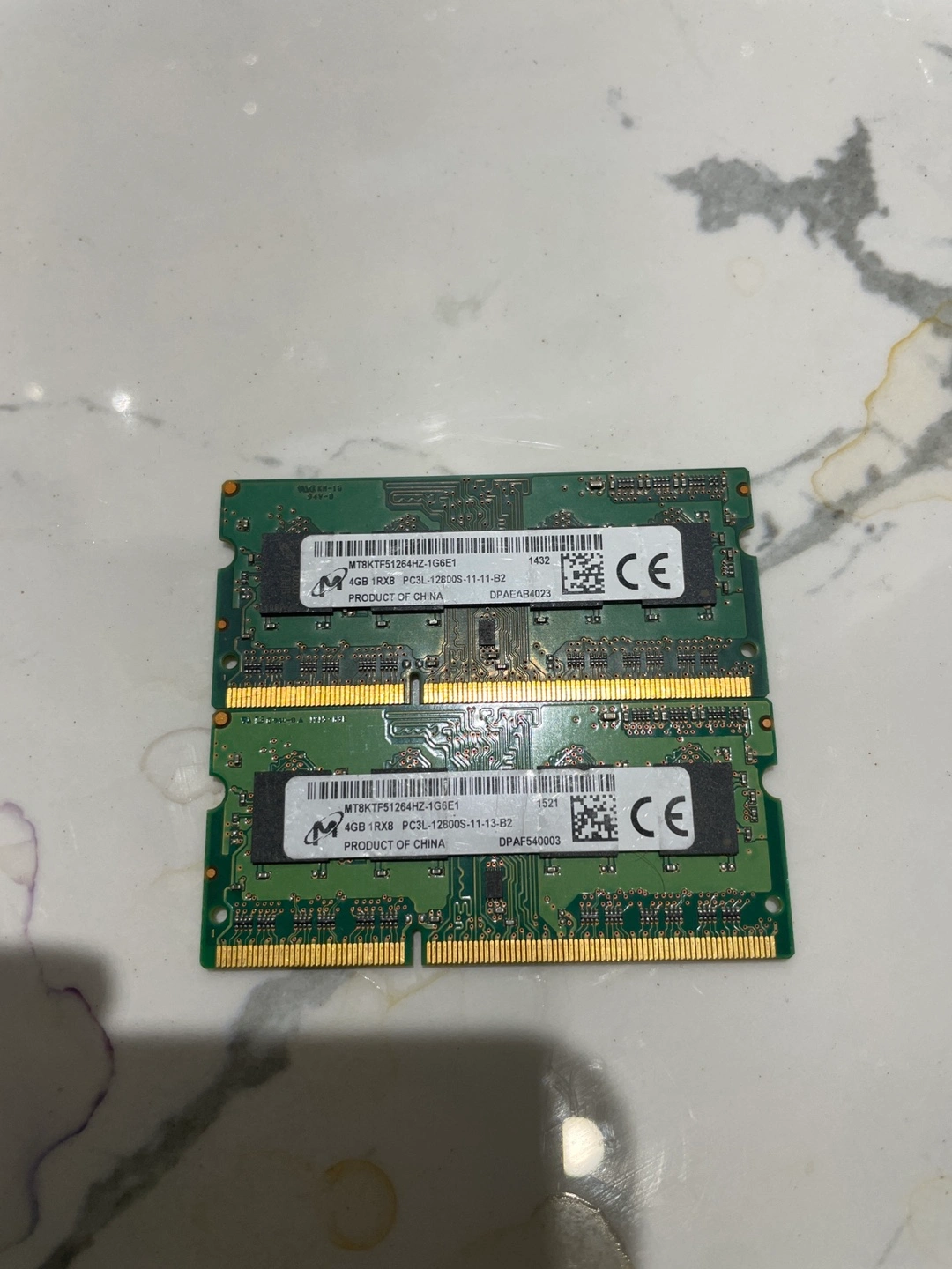 Two sticks of 4GB DDR3 PC3L-12800S RAM memory. Brand: MT8KTF51264HZ-1G6E1 Each of these $10