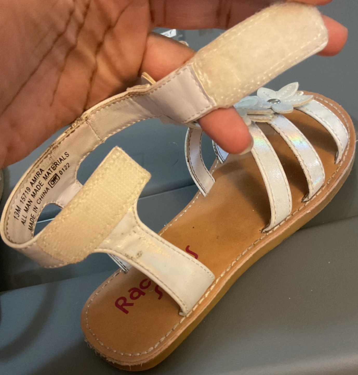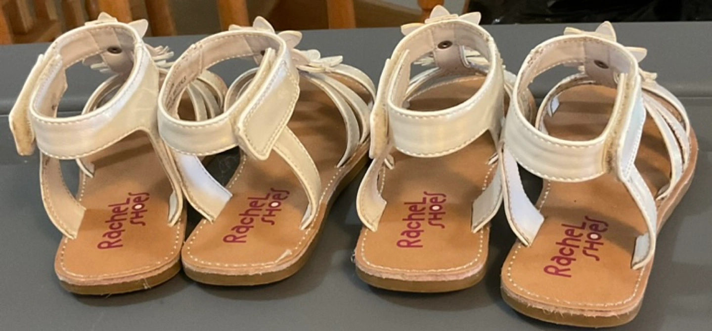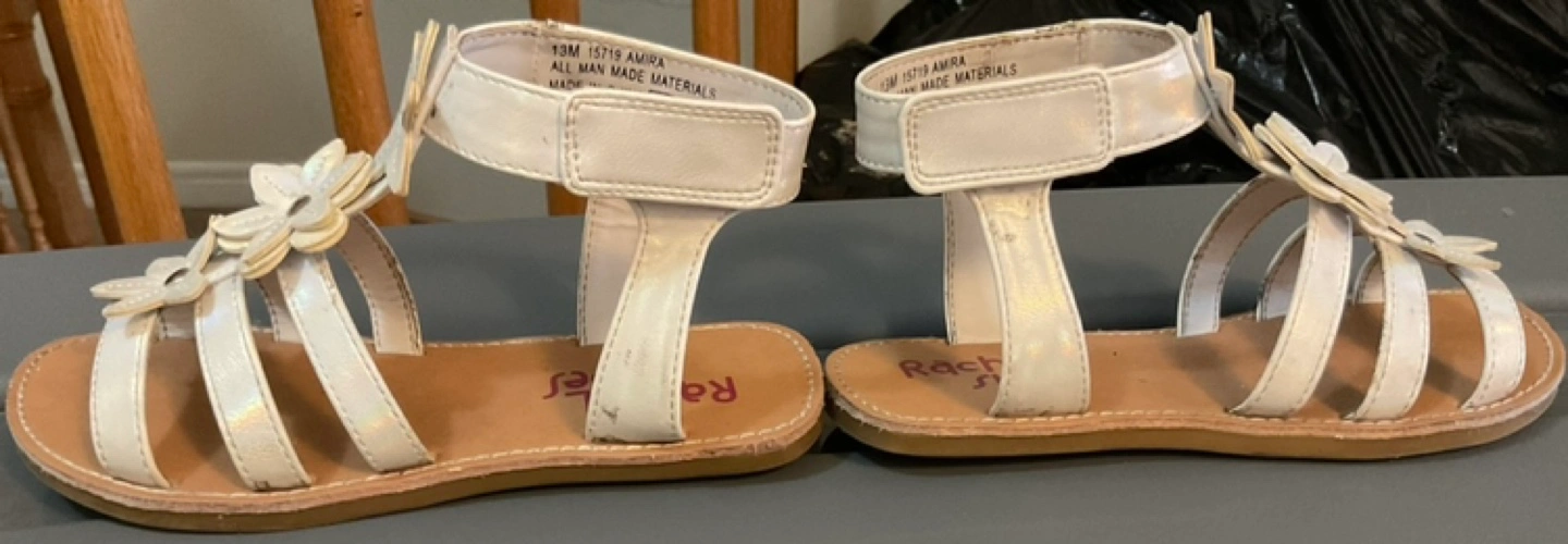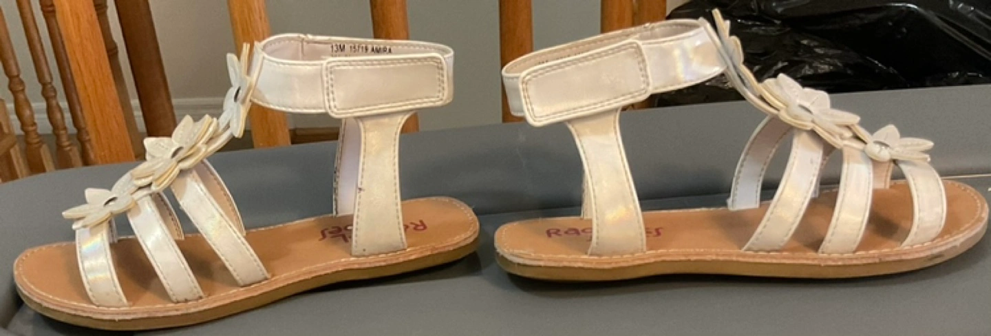 Selling used white-iridescent sandals with velcro closures and flower accents for kid/girls in size 13M. They’re in great condition with everything intact. Firm price, selling as is for $10 each or $20 for both.