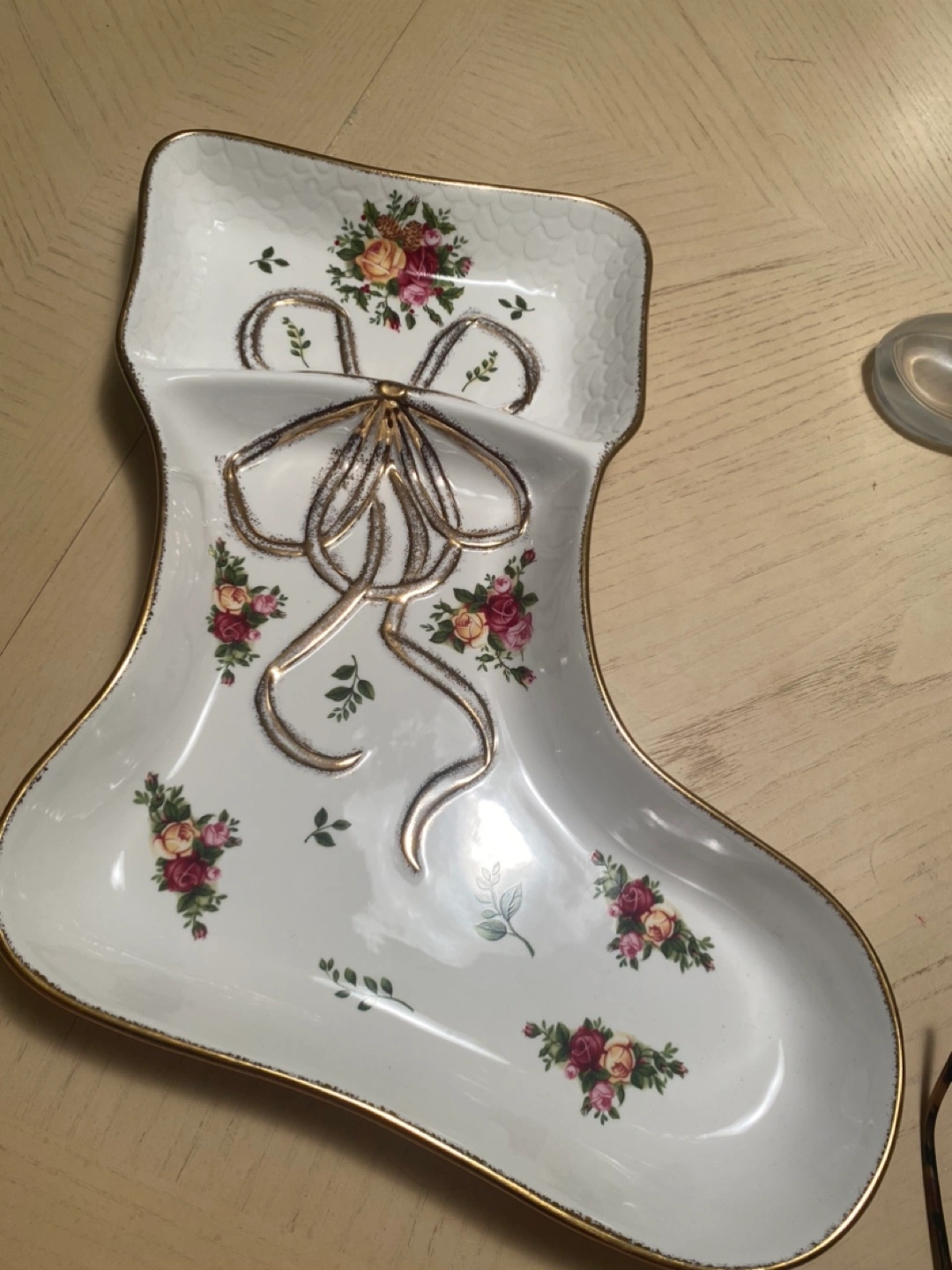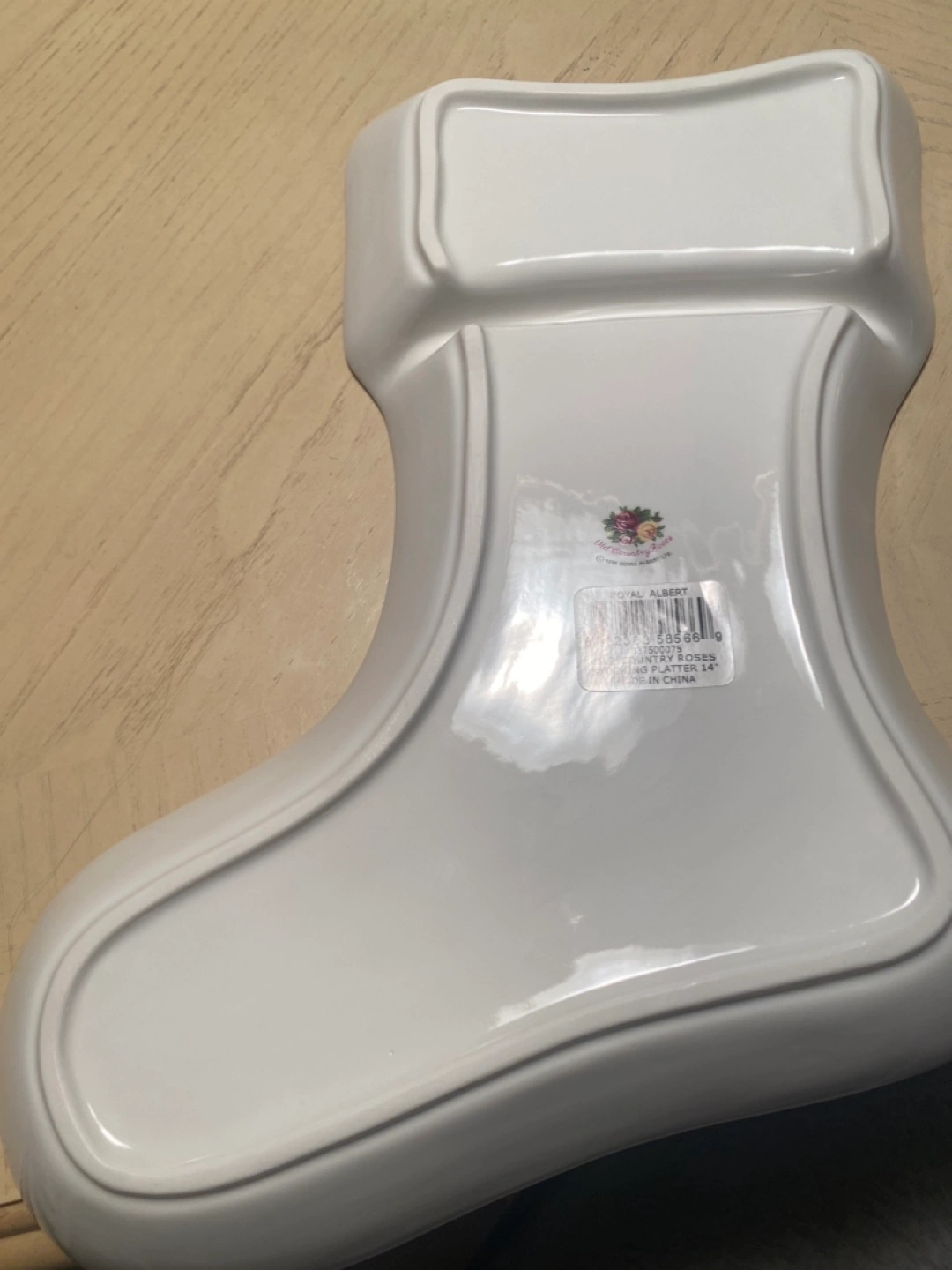 White porcelain serving dish in the shape of a stocking.
