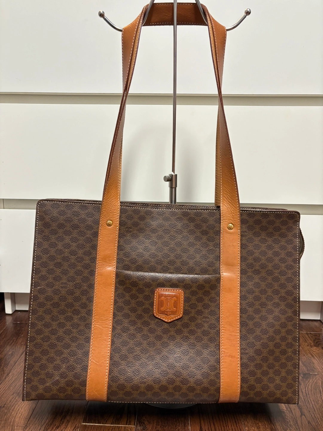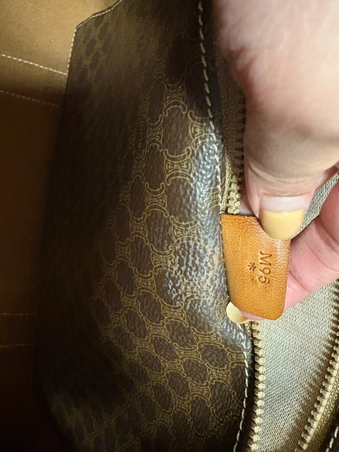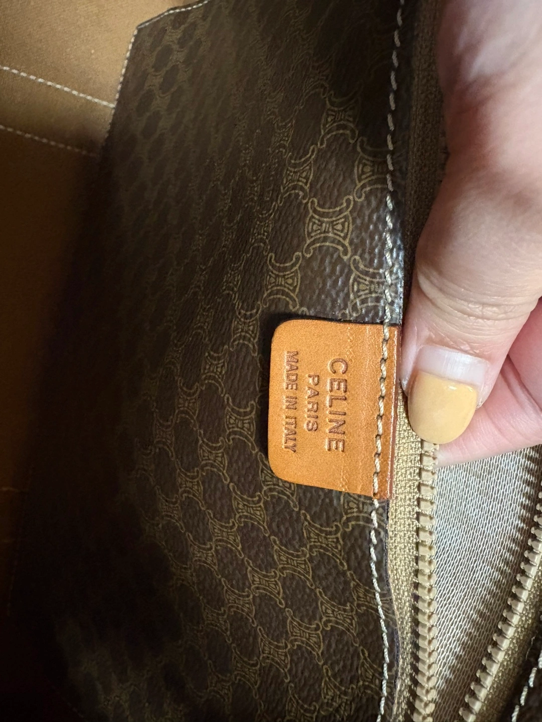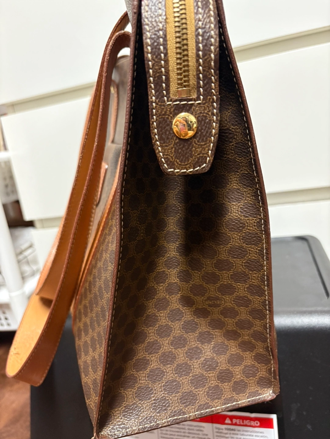 Celine Shoulder Bag Brown Macadam Gold-Tone Hardware Leather Trim Flat Handles & Dual Shoulder Straps Leather Trim Embellishment Leather Lining Zip Closure at Top Details Estimated item measurements Shoulder Strap Drop: 12.5" Shoulder Strap Drop Min: 10" Height: 11" Width: 15.25" Depth: 5"