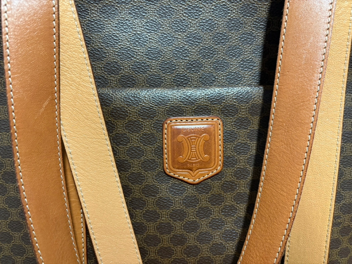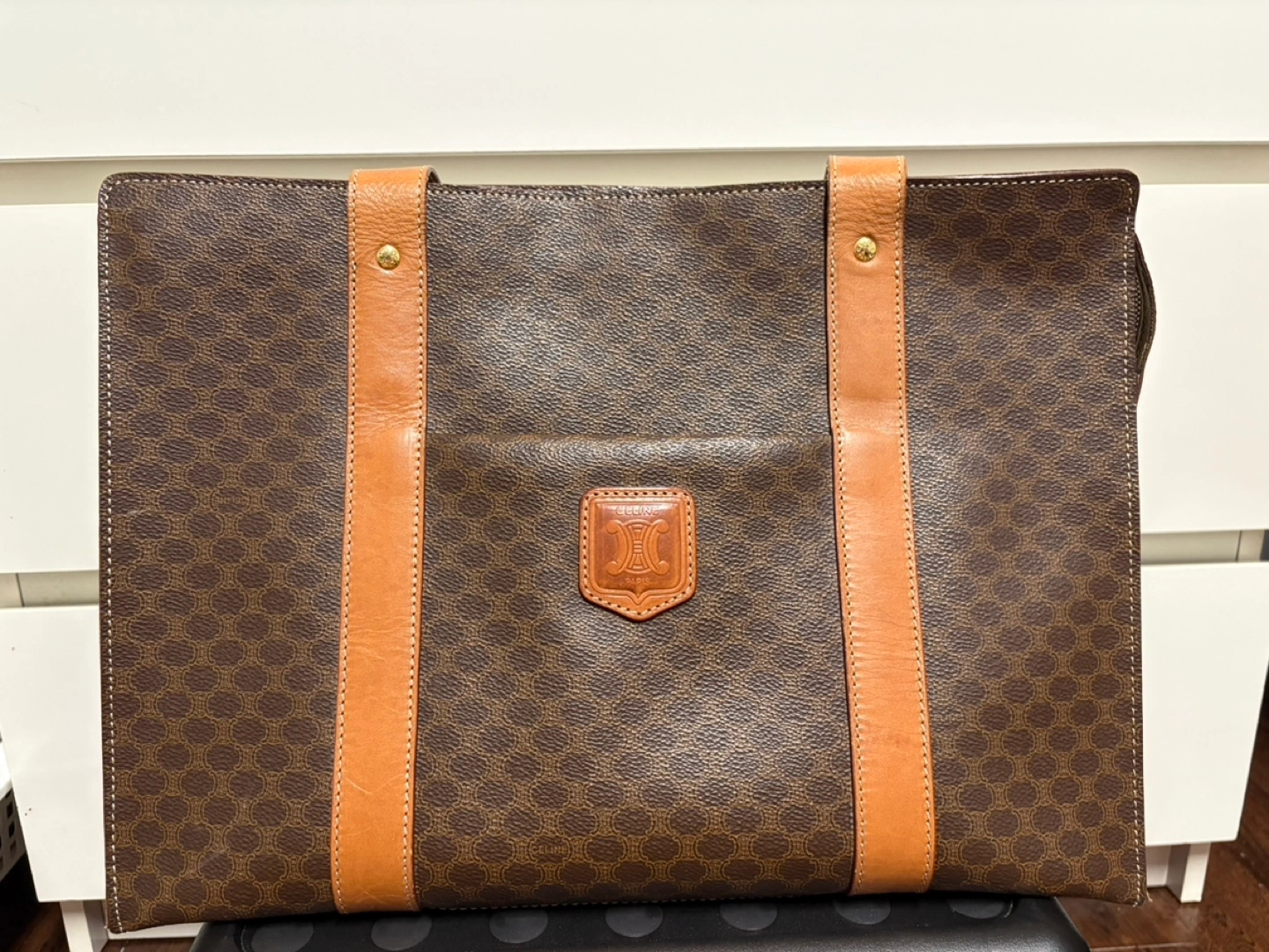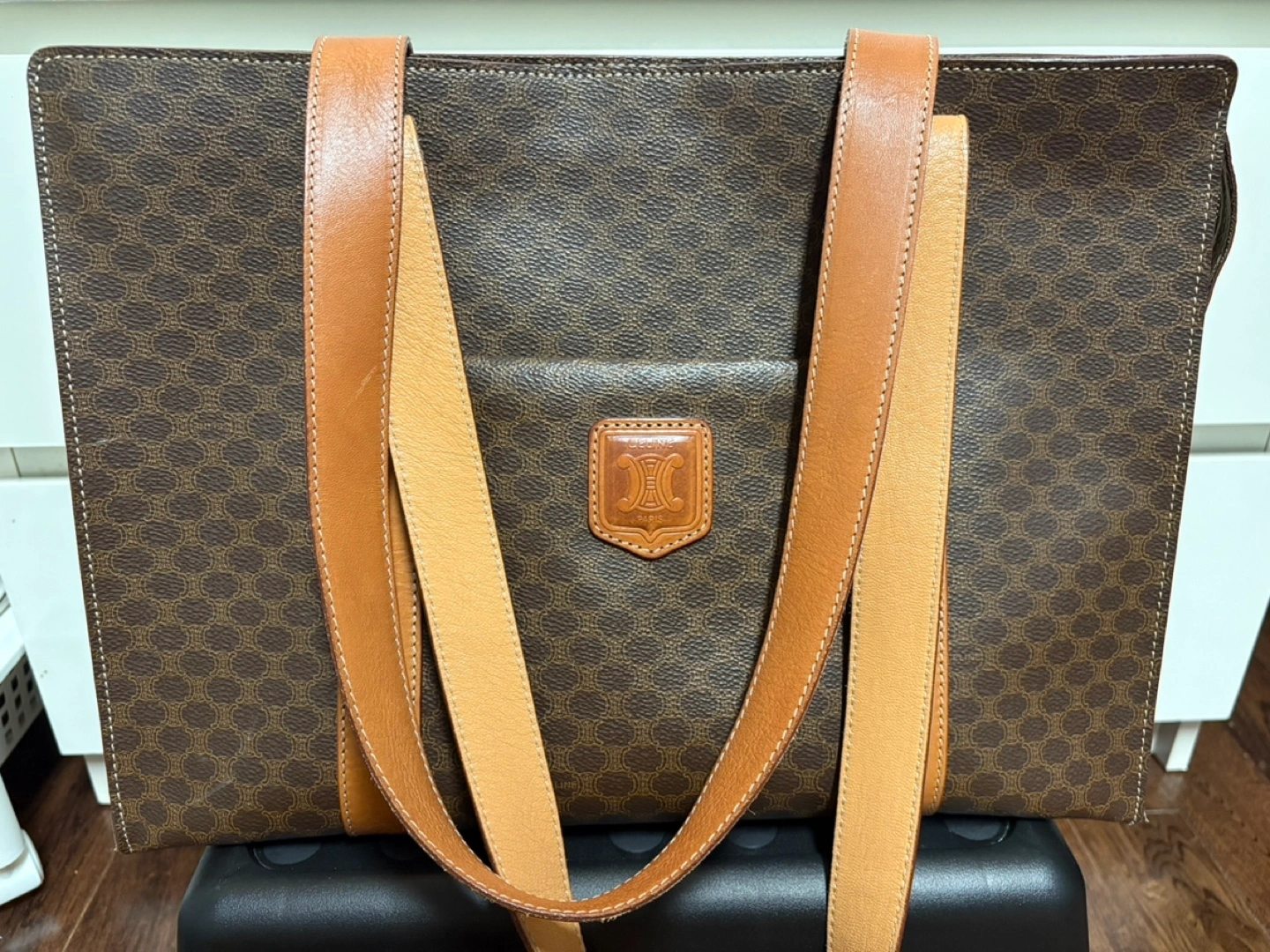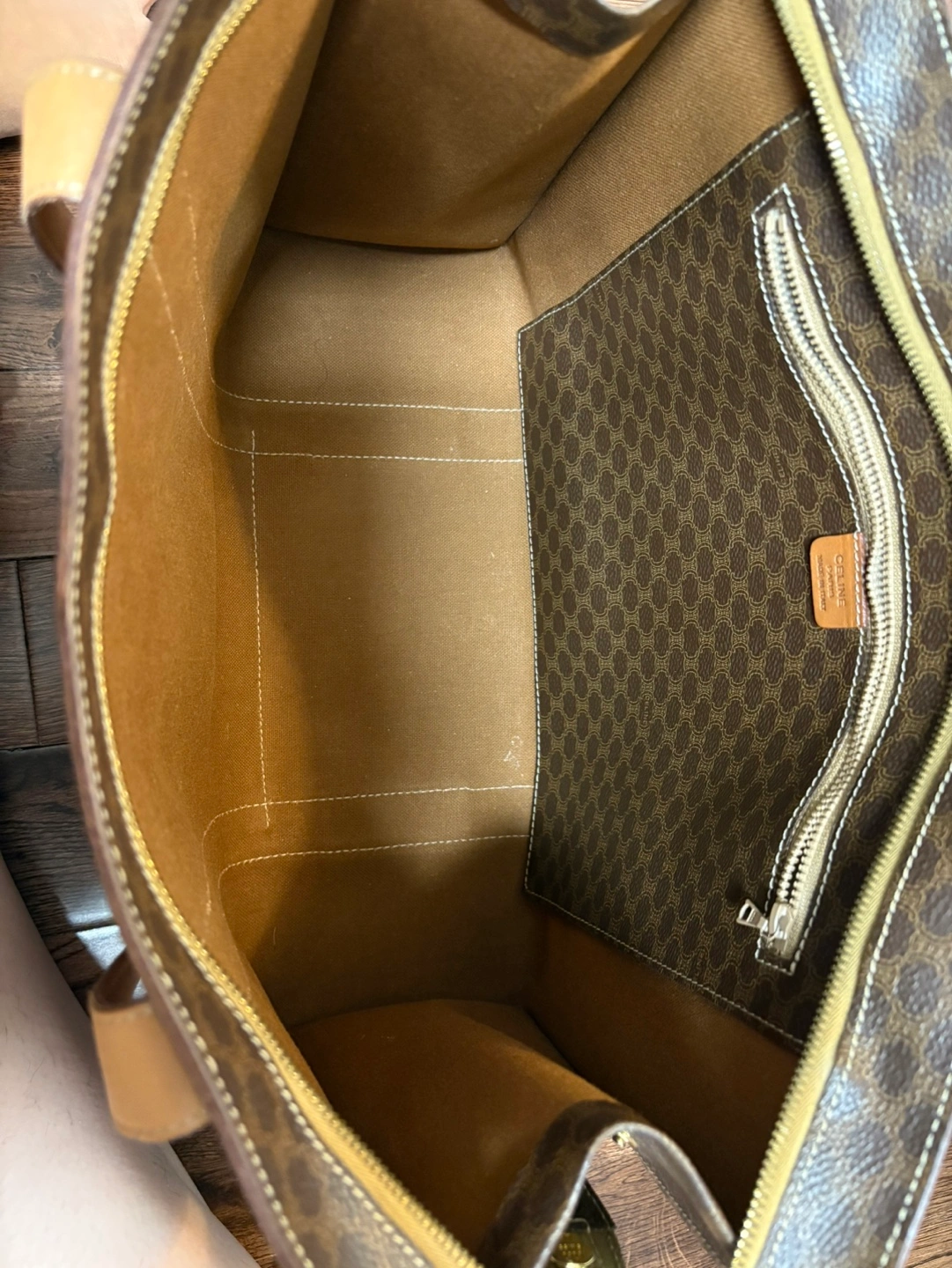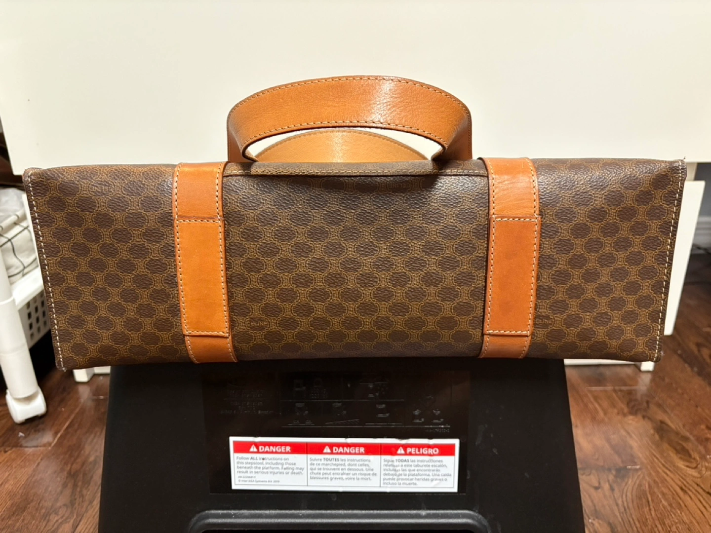 Celine Shoulder Bag Brown Macadam Gold-Tone Hardware Leather Trim Flat Handles & Dual Shoulder Straps Leather Trim Embellishment Leather Lining Zip Closure at Top Details Estimated item measurements Shoulder Strap Drop: 12.5" Shoulder Strap Drop Min: 10" Height: 11" Width: 15.25" Depth: 5"