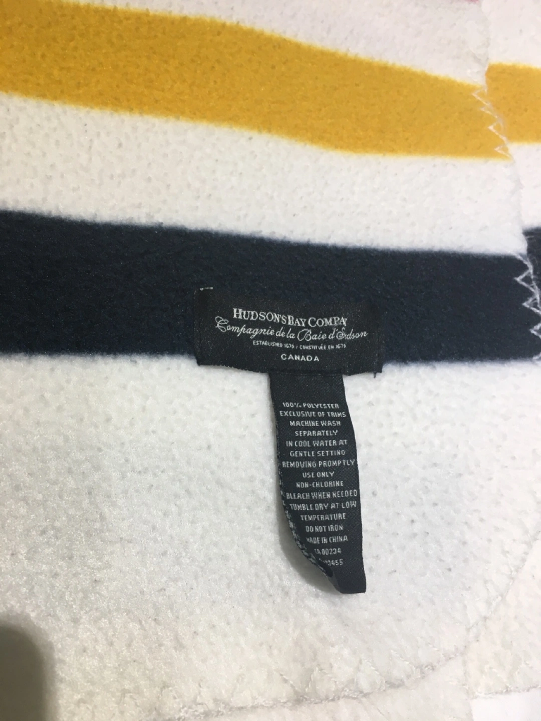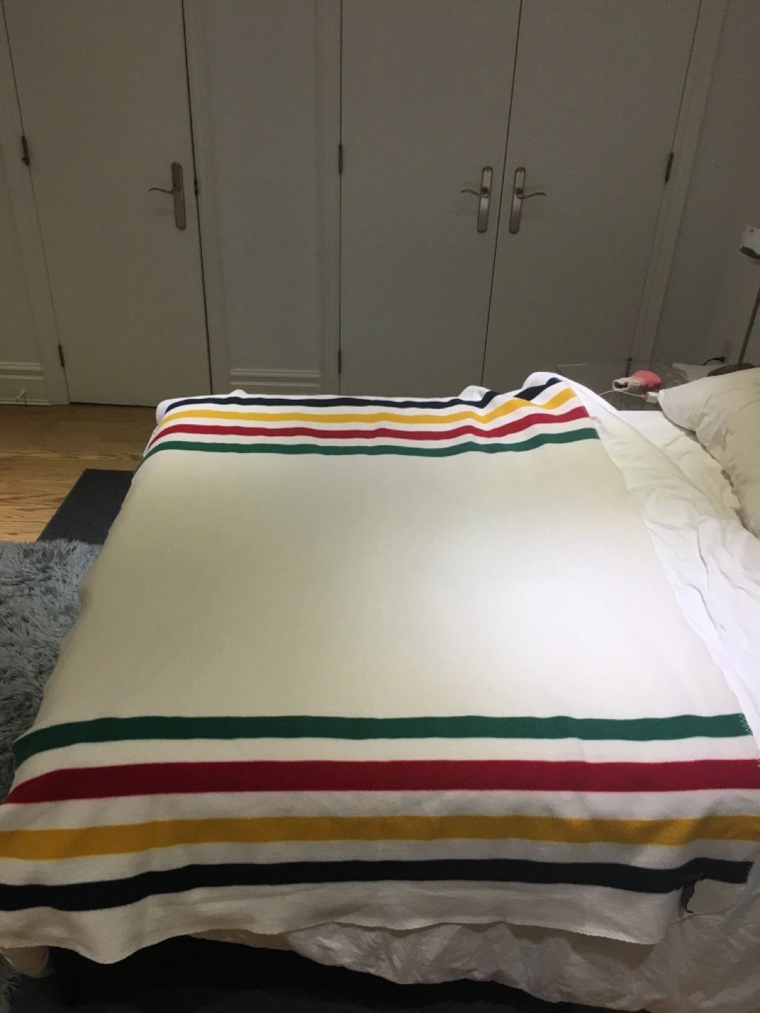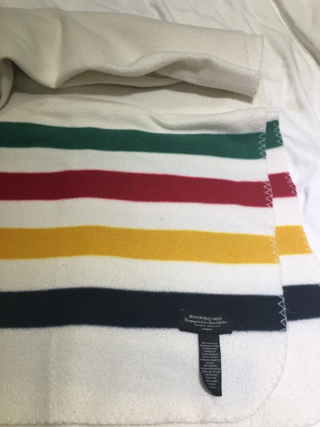 Iconic Striped point blanket. White background with green, red, yellow, and navy blue stripes. Made from fleece. Pre-loved but is still durable. Cash and pick up only