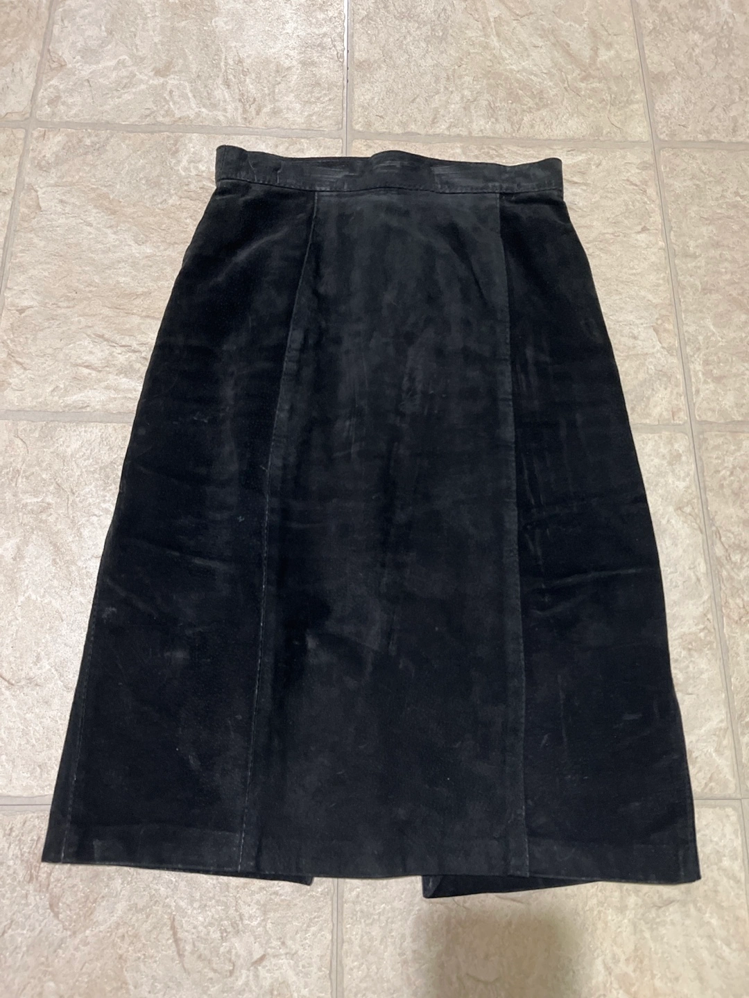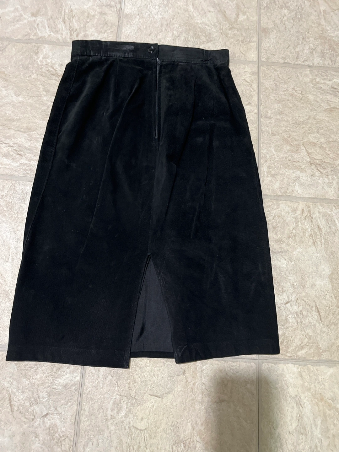 Black lined suede skirt. A-line, knee-length, 25 “ long with a centre back slit.