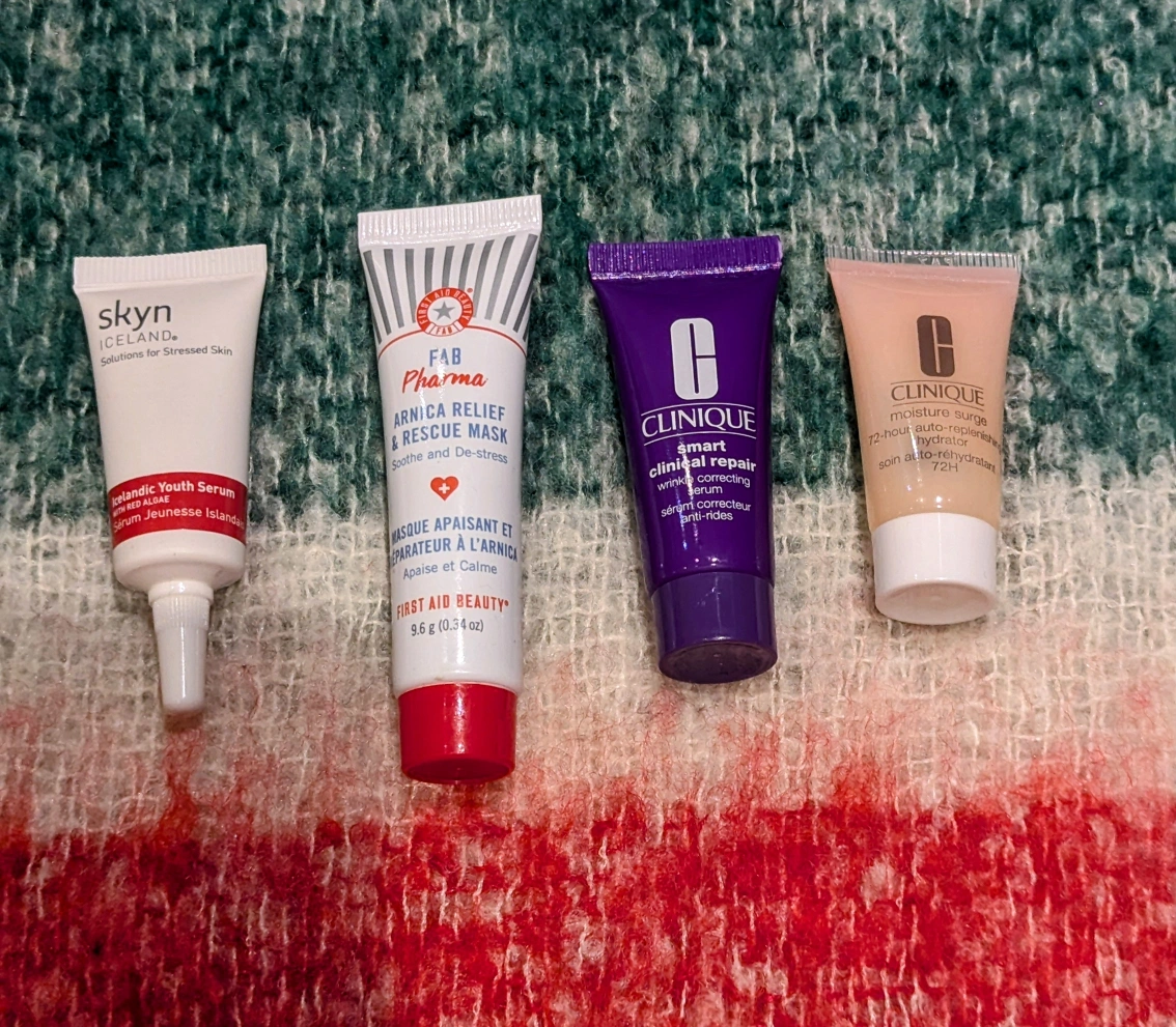 Brand new and never used. Trial sizes (Product details left to right in photo): 1) Sky Iceland Serum Size 5ml, retail value $12 2) First aid beauty Arnica Relief & Rescue Mask Size 9.6g, retail value $6 3) Clinique wrinkle correcting serum Size 10ml, retail value $38 with tax 4) Clinique moisture surge moisturizer Size 7ml, retail value $8 with tax Total retail value of set $64 with tax.