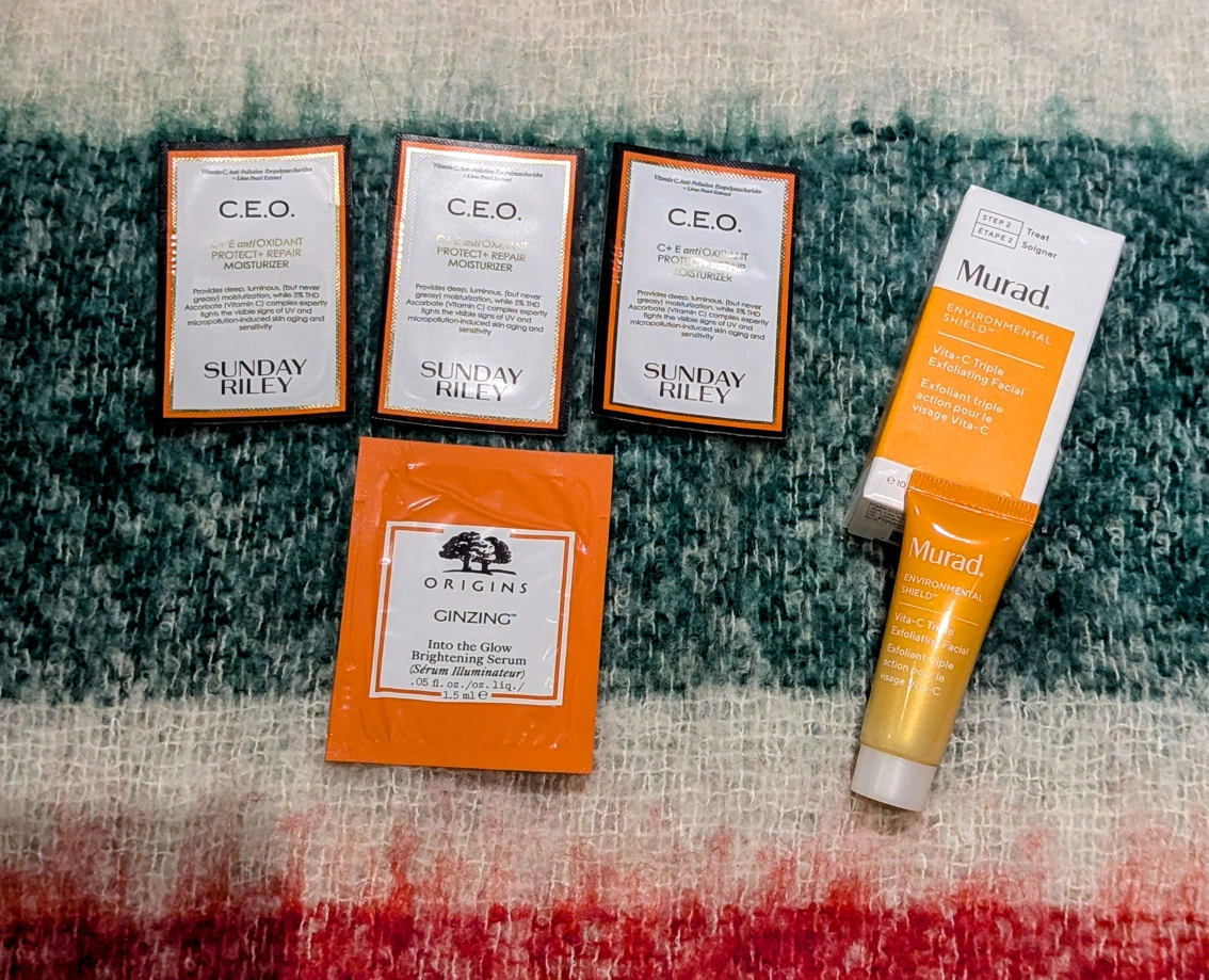 Brand new. Skincare samples from Sunday Riley, Origins, and Murad. 3 Sunday Riley samples of CEO C.E.O. 1 Origins sample Glow Brightening Serum 1 trial size Murad Environmental Shield Vita-C Triple Exfoliating Facial. (10ml)