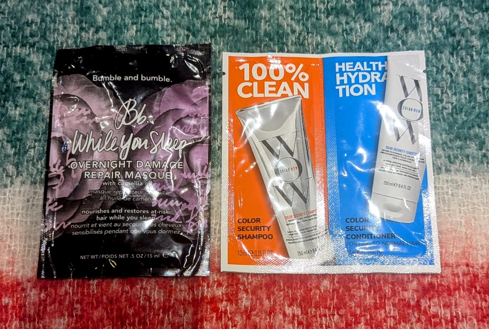 Brand new travel-sized hair care products. Bumble and bumble overnight hair mask (15ml) WOW colour treated hair shampoo (10ml) and conditioner. (10ml)