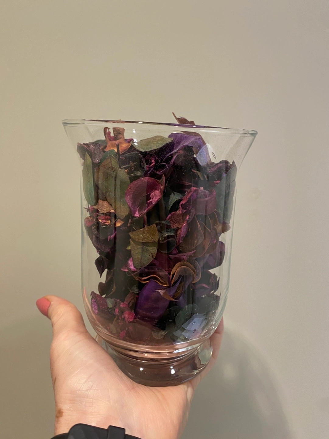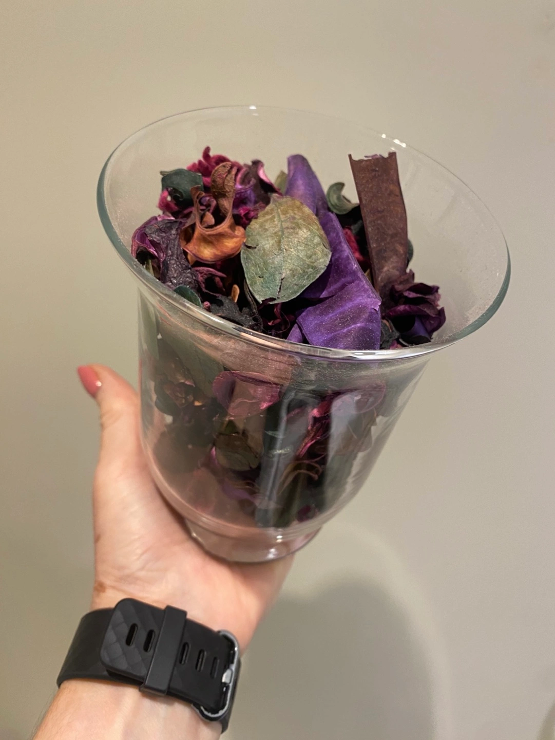 Potpourri in a glass vase. The vase has a wide mouth and a rounded base. Size is 6 inches in height