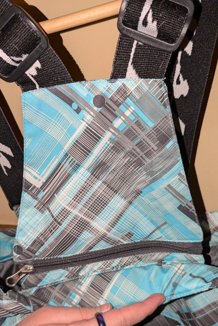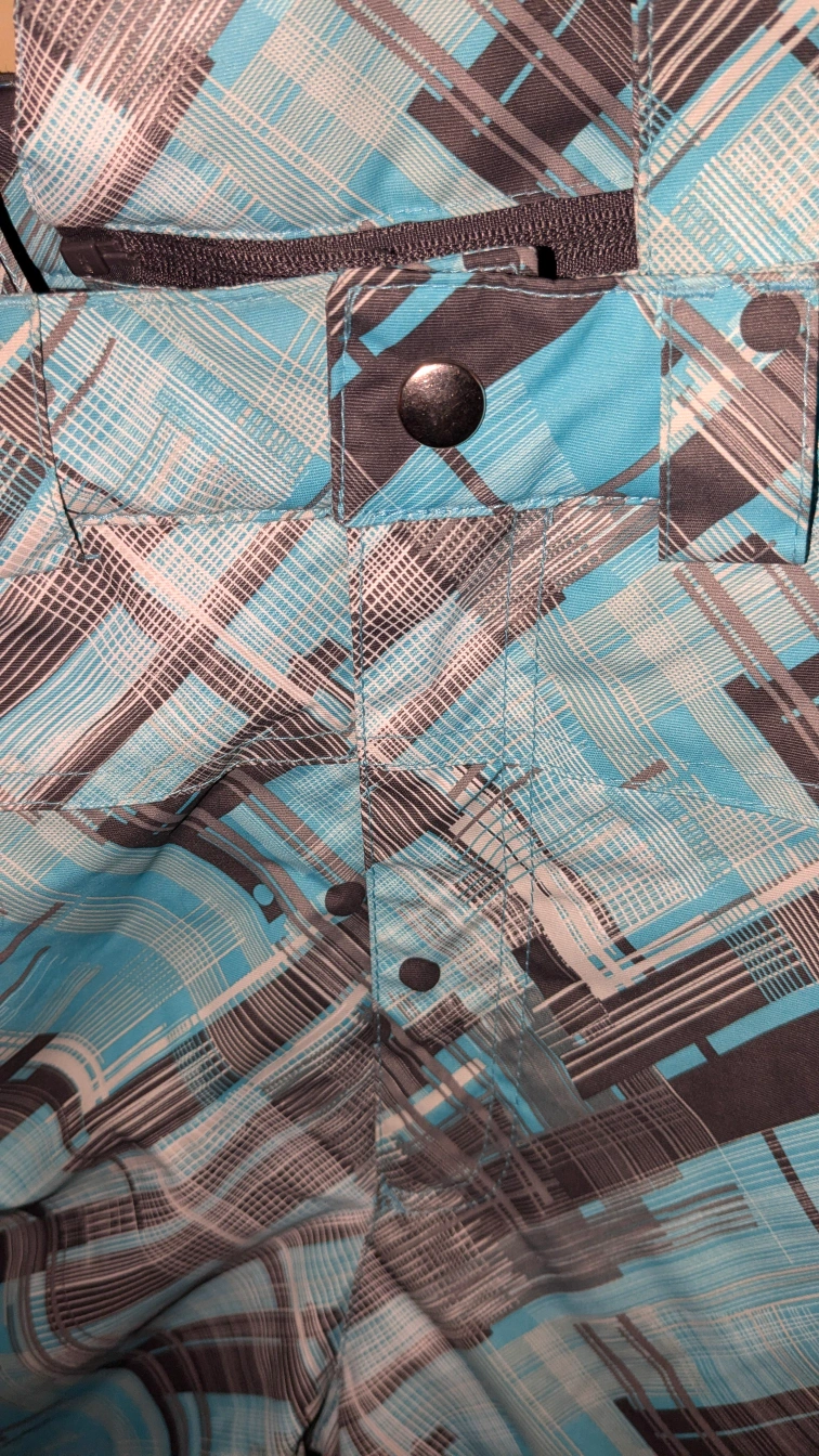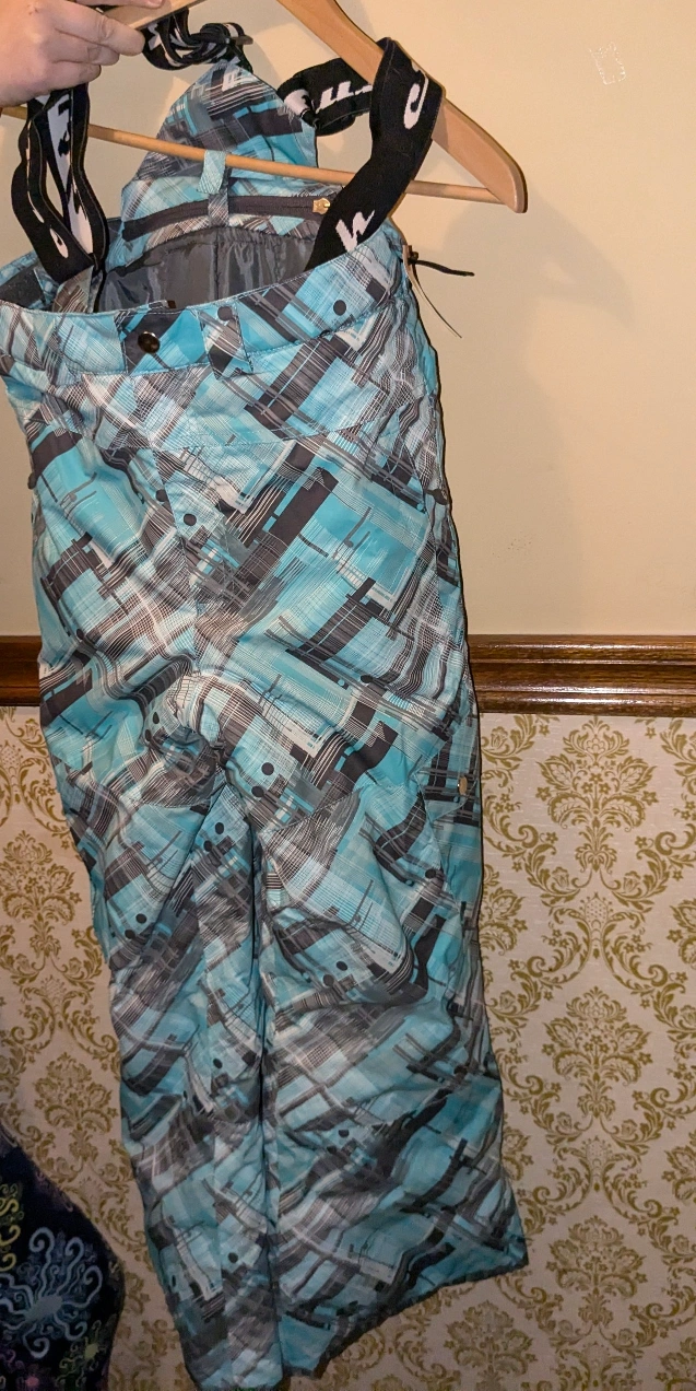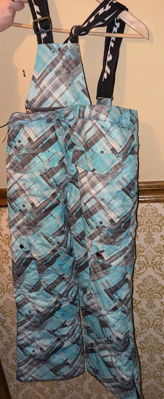 Blue and black snow pants with adjustable straps. Size 12. Never worn. The waste can be tightened with velcro on the left and the right side. There is also a button closure on the waist. please see photos . The elastic suspenders can be removed with a zipper in the back and velcro on both sides in the front. Thank you for looking at our listing. We always welcome questions . From a smoke-free home.