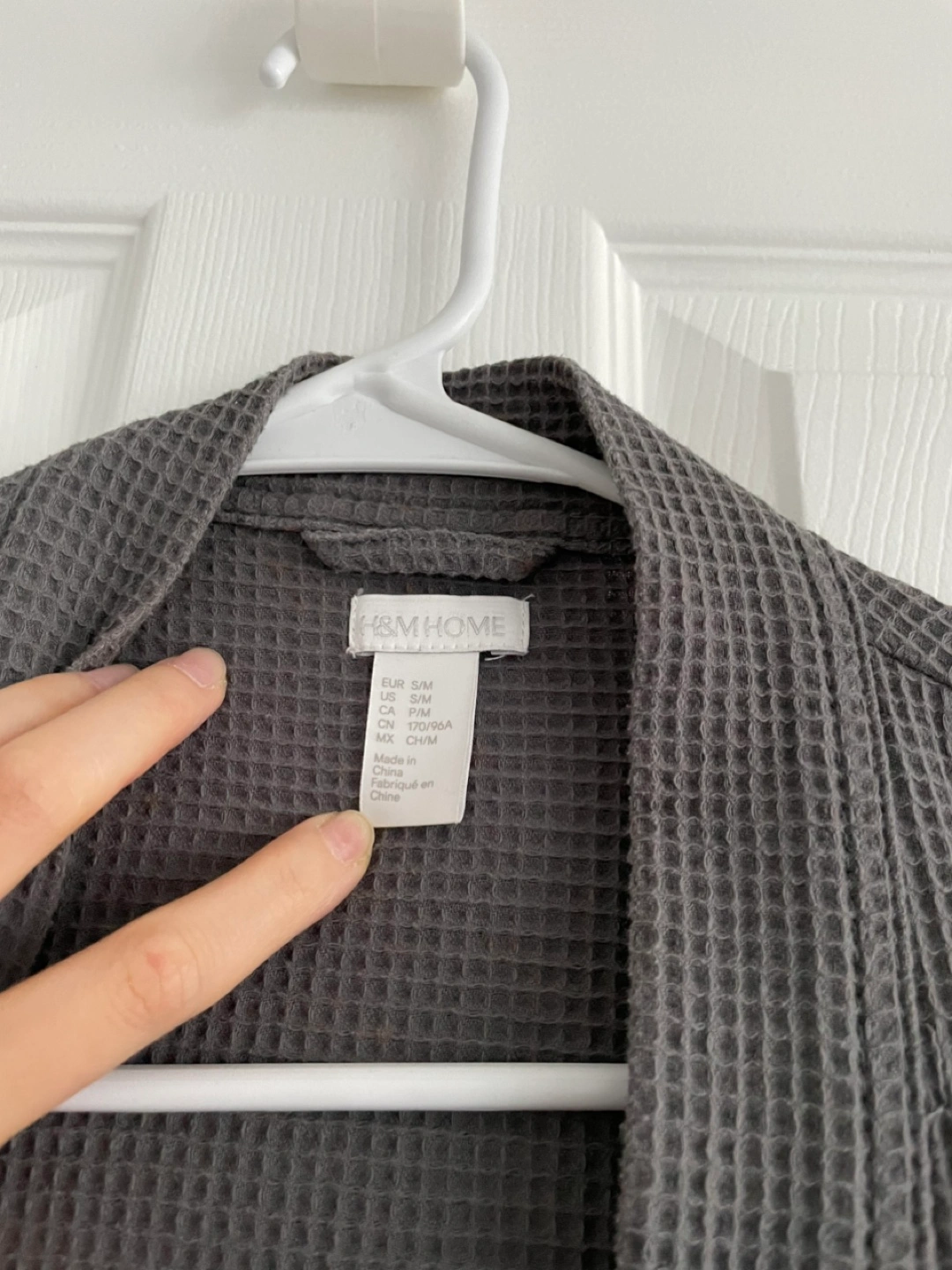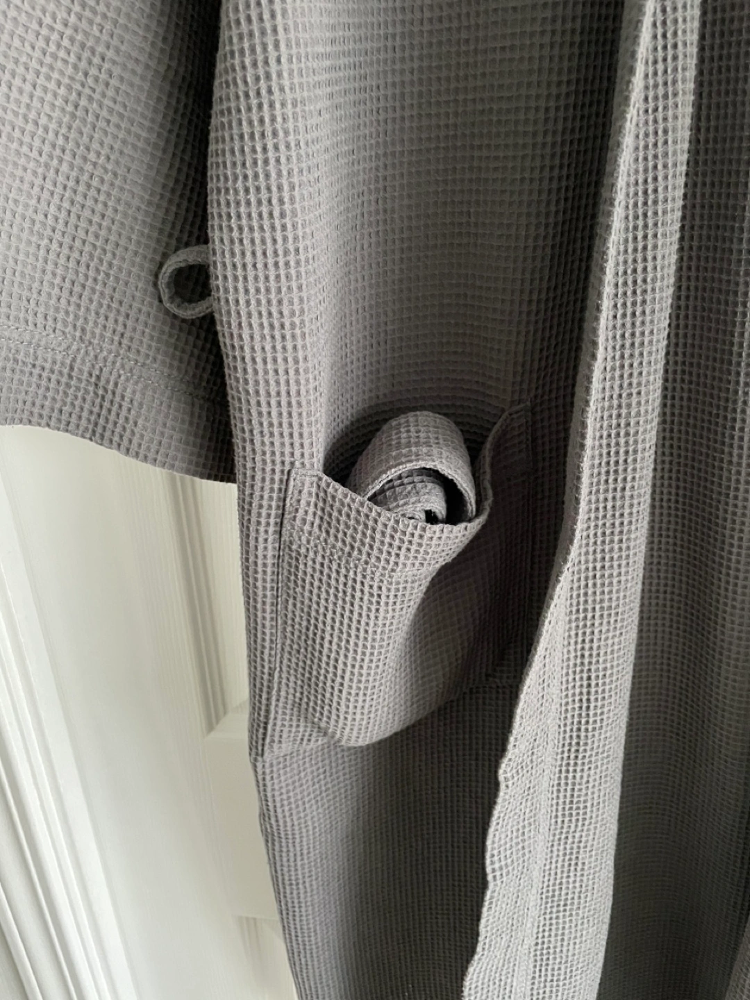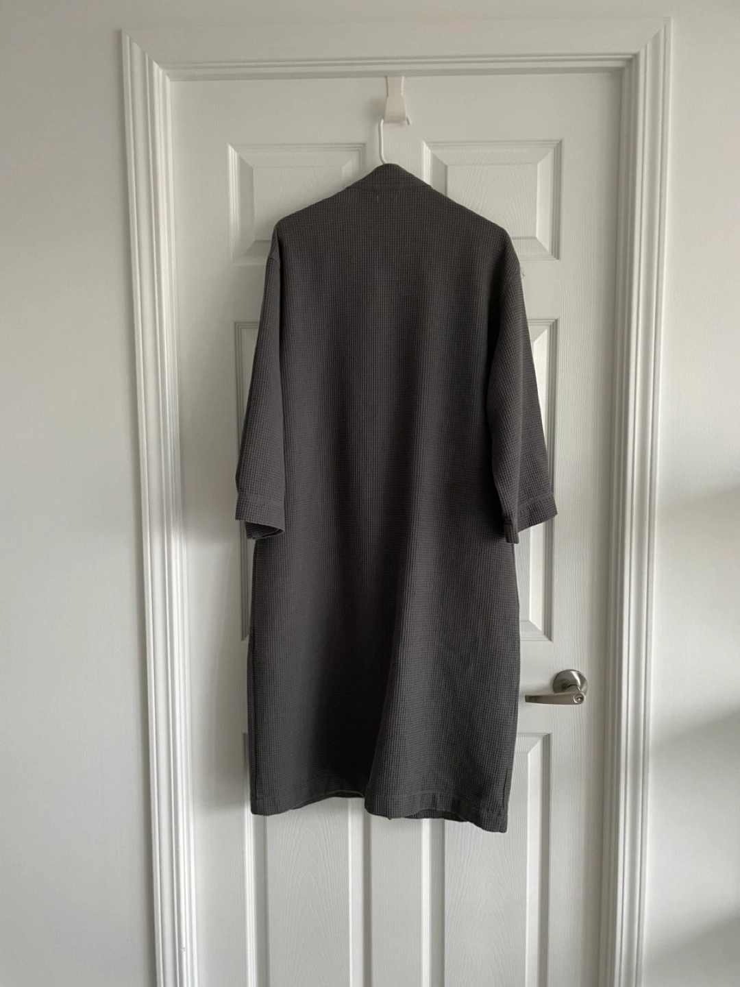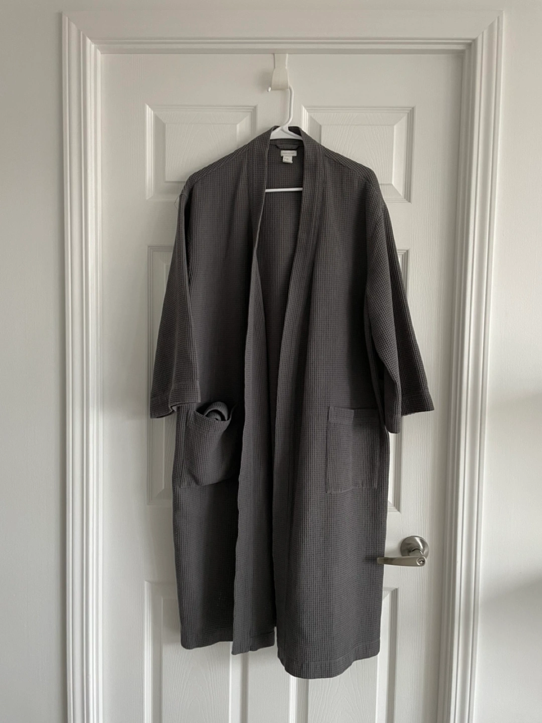 Grey waffle robe with a belt. Has 2 front pockets. Size S/M. Below-knee length. From a pet-free, smoke-free home.
