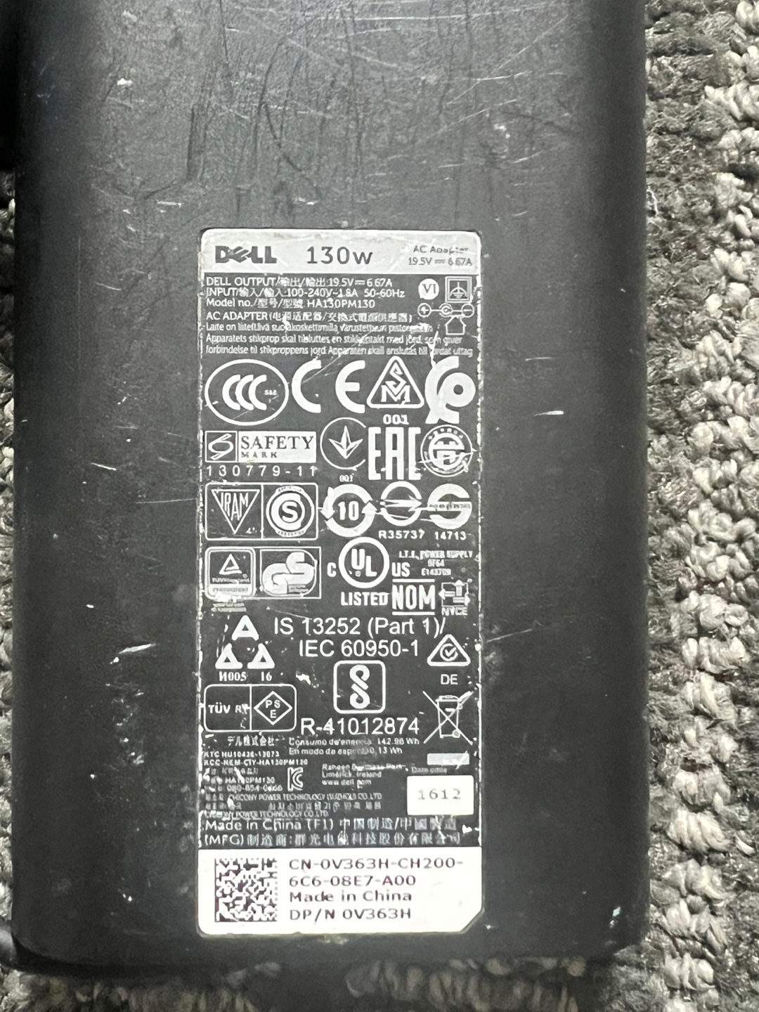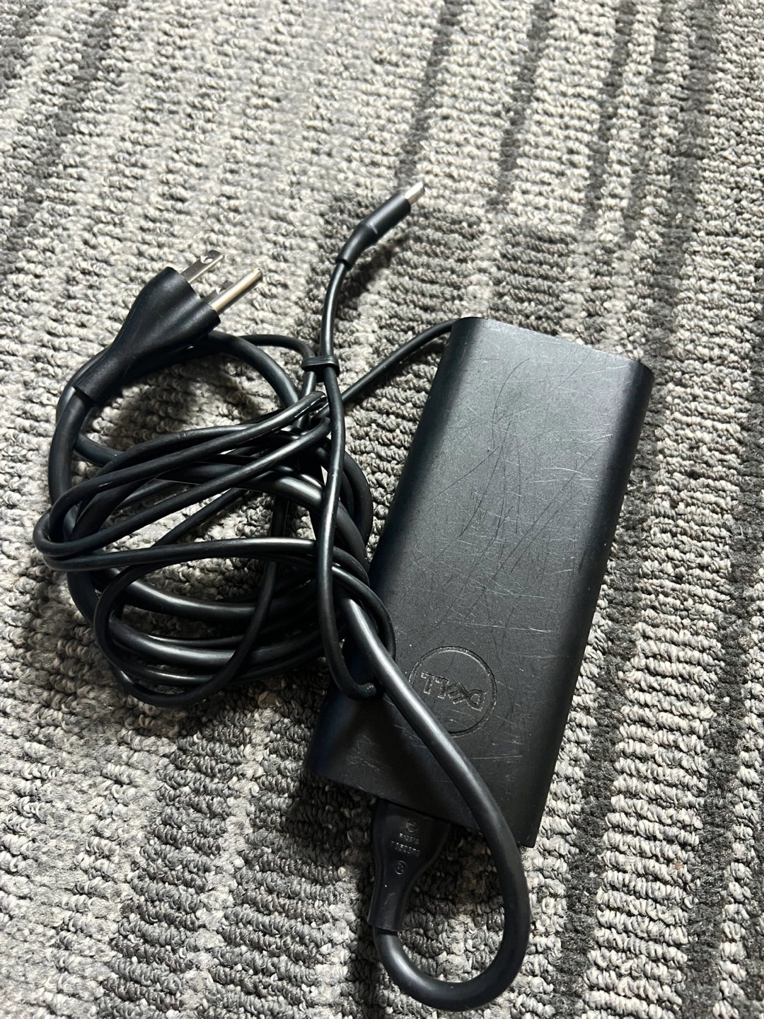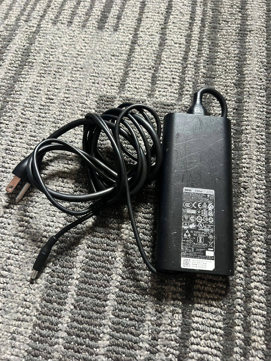 Dell laptop charger, 130W. Includes power cord. Compatible with various XPS, Latitude, and Inspiron laptops.