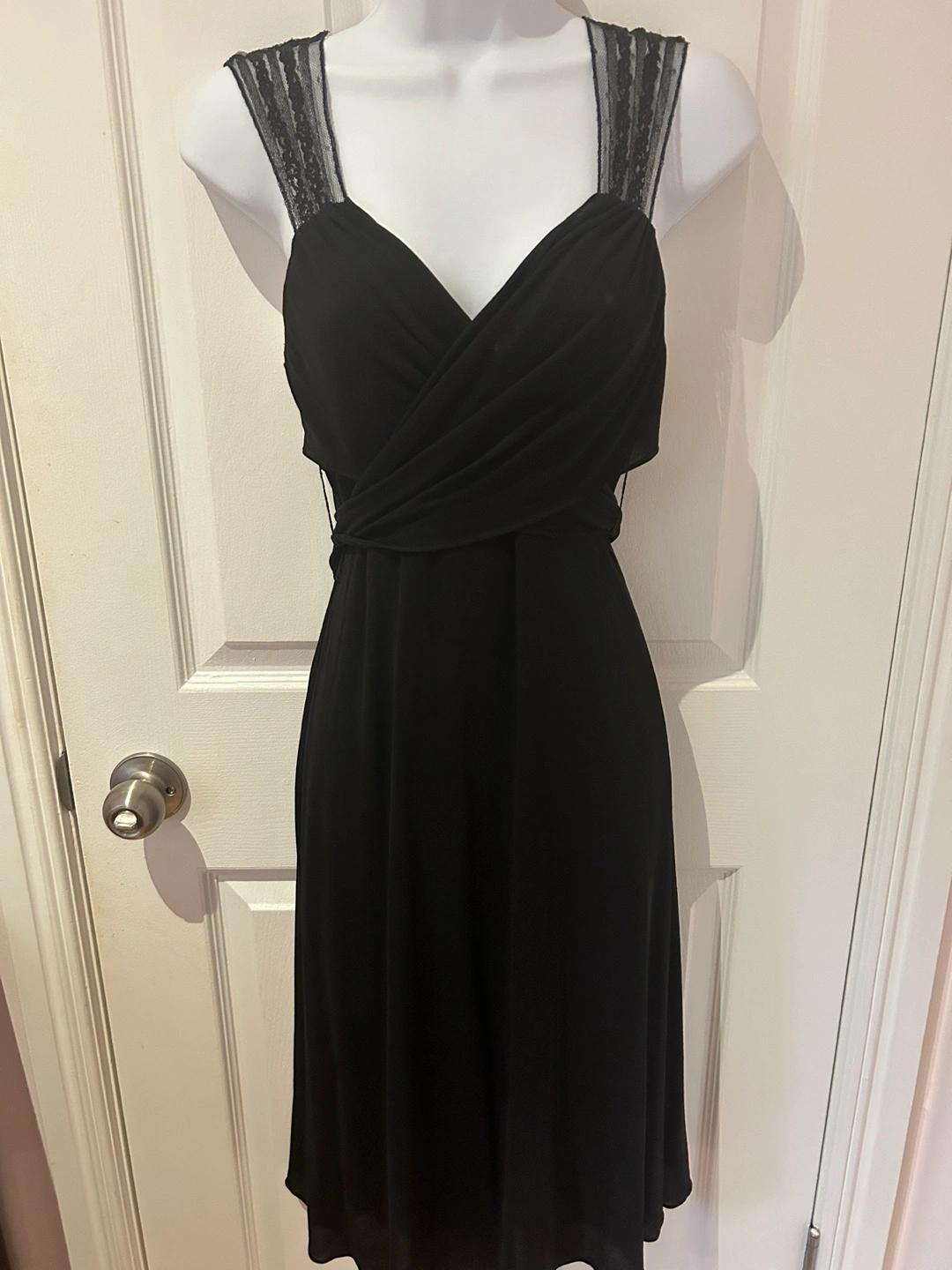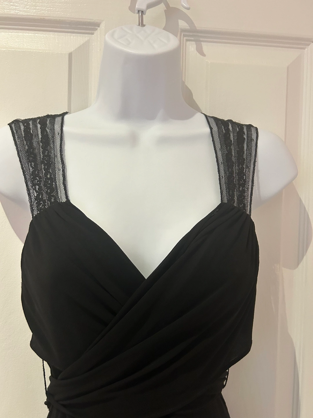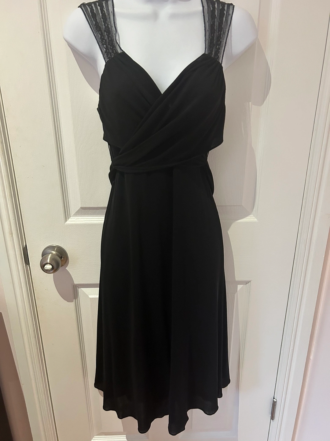 NWT Black sleeveless dress with lace detail on the straps. V-neck and a wrap-style bodice. A-line silhouette. Knee length. Made In USA Retails for $288
