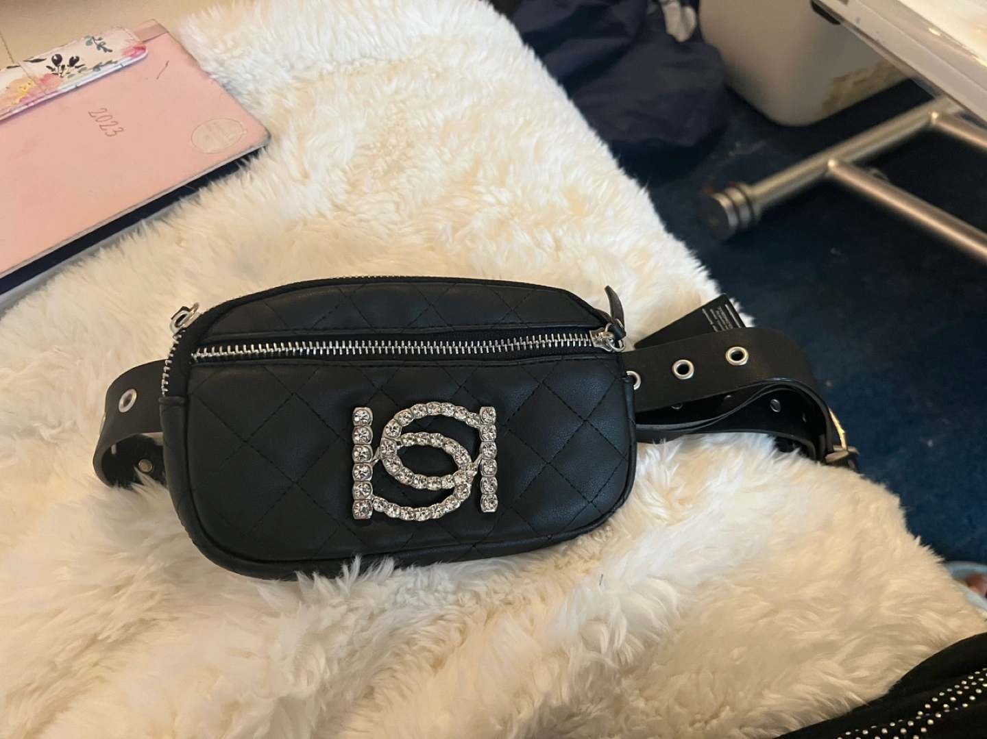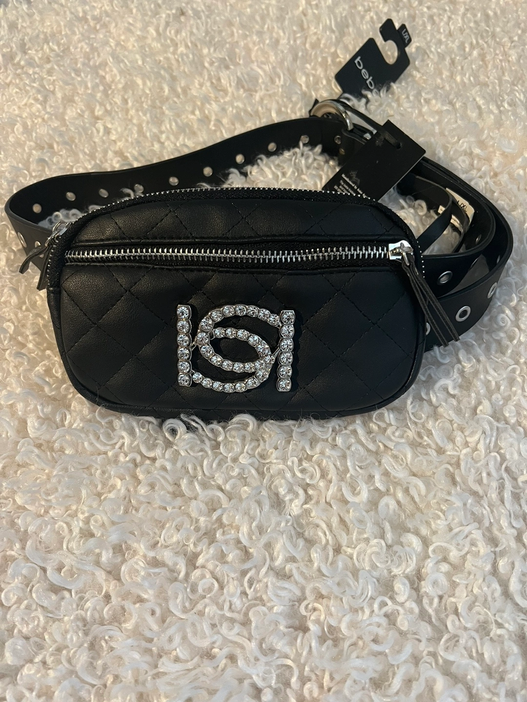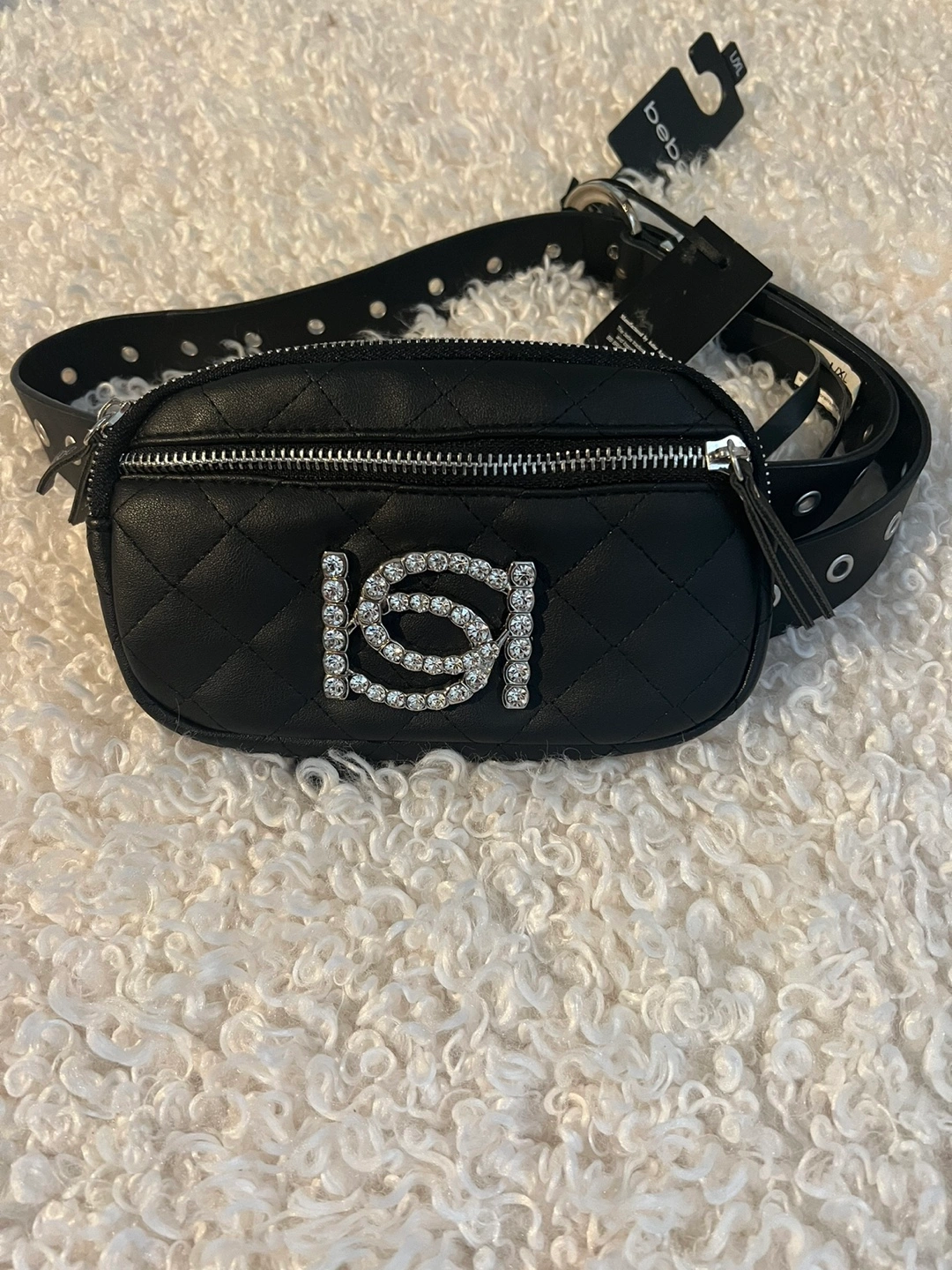Black quilted belt bag with rhinestone detail and adjustable belt. 2 packet