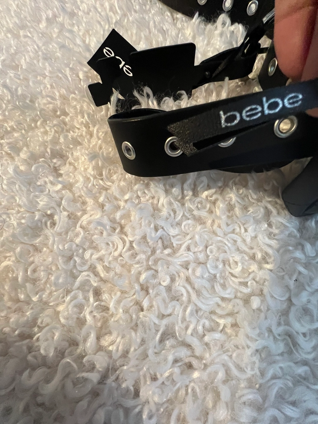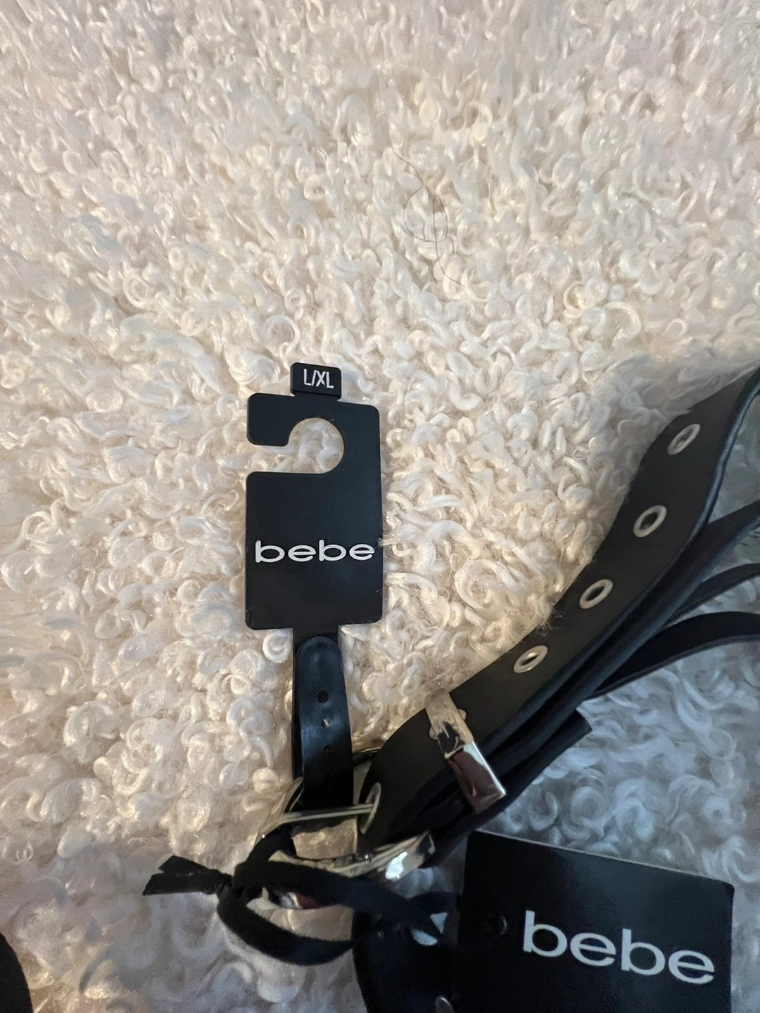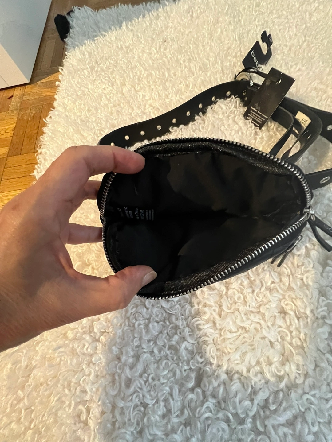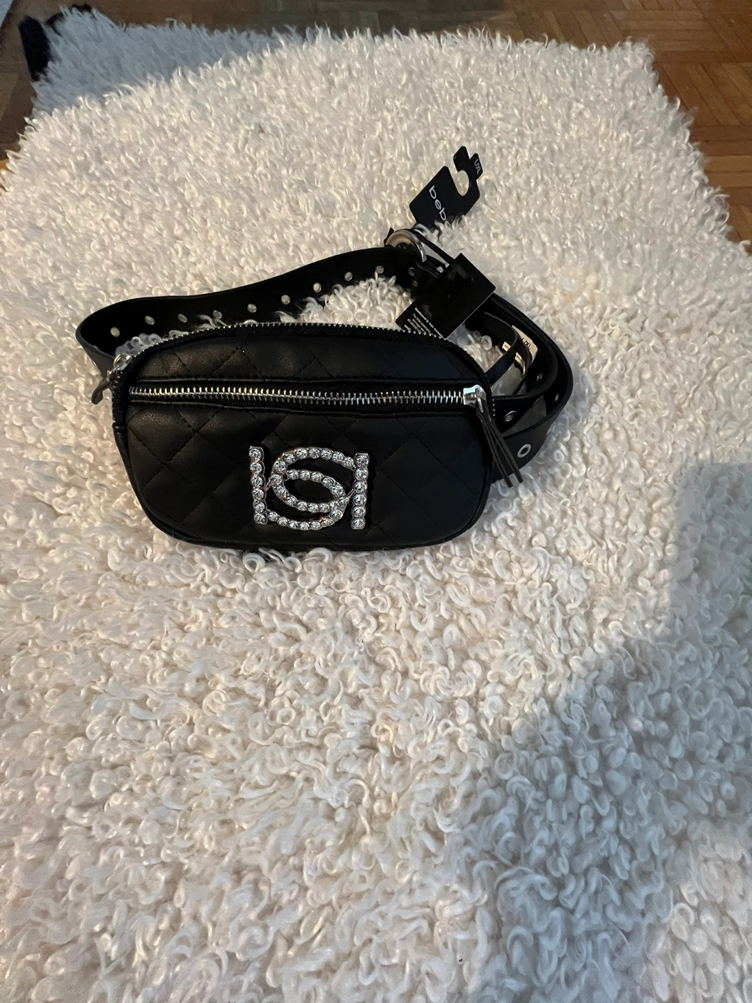 Black quilted belt bag with rhinestone detail and adjustable belt. 2 packet
