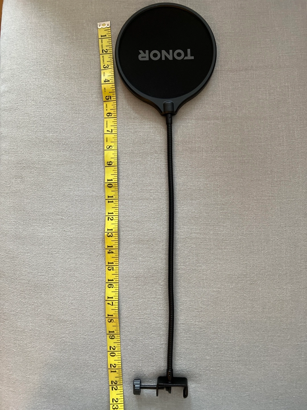 Black microphone pop filter with a flexible gooseneck stand and a clamp.