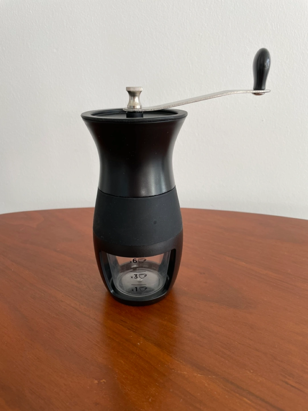 Black manual coffee grinder. Has a clear plastic cup at the bottom with markings for 1, 3, and 6 cups’ worth of ground coffee.