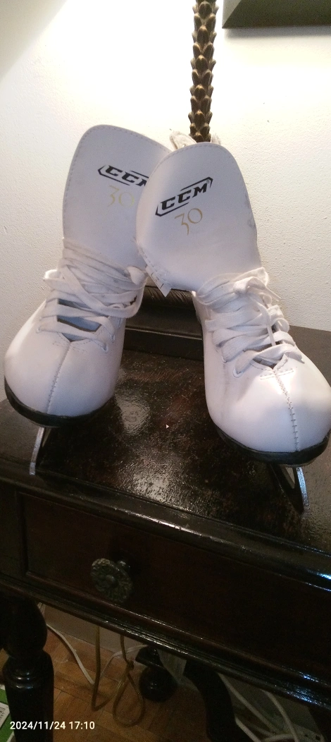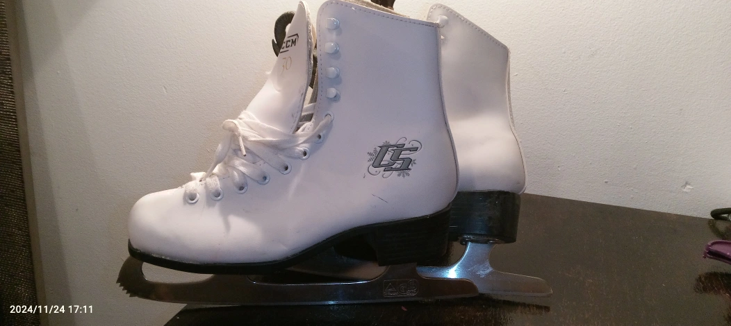 White figure skates. Size 5 blade made need sharpened this includes 2 sets guards to protect the blade.