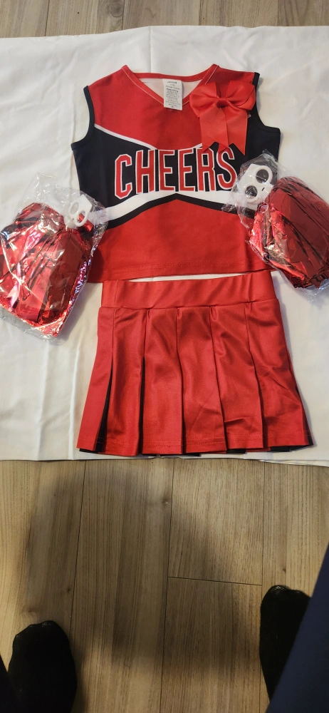Red and black cheerleader costume with a skirt and top. Includes two red pom-poms.