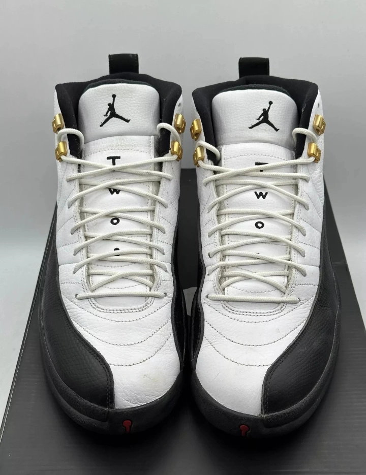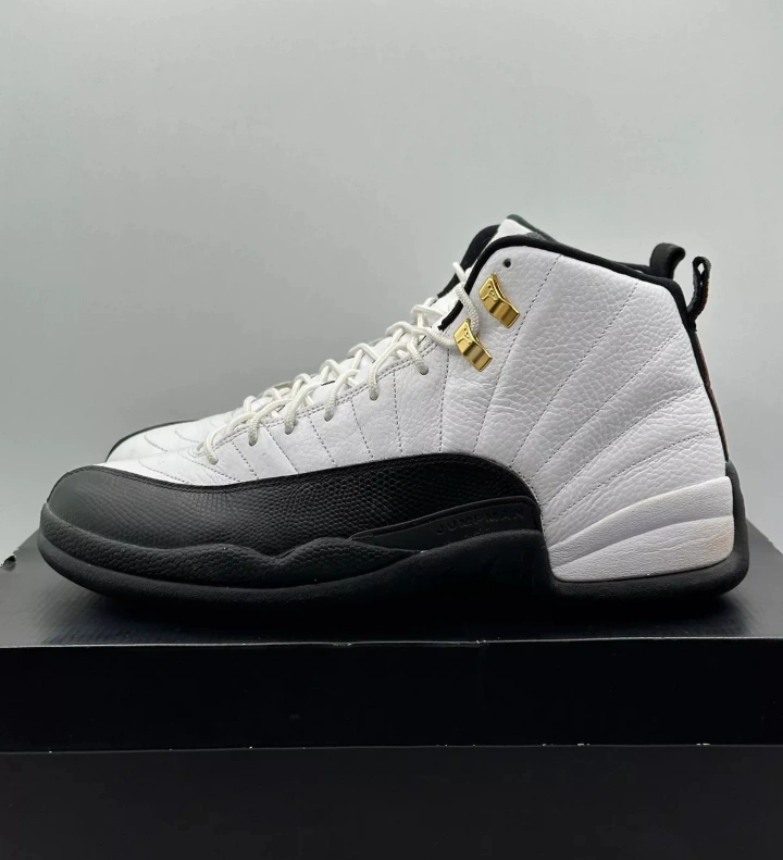 White and black leather sneakers. Gold accents on the laces. The shoes are in good condition with only minor signs of wear. They come with the original box.