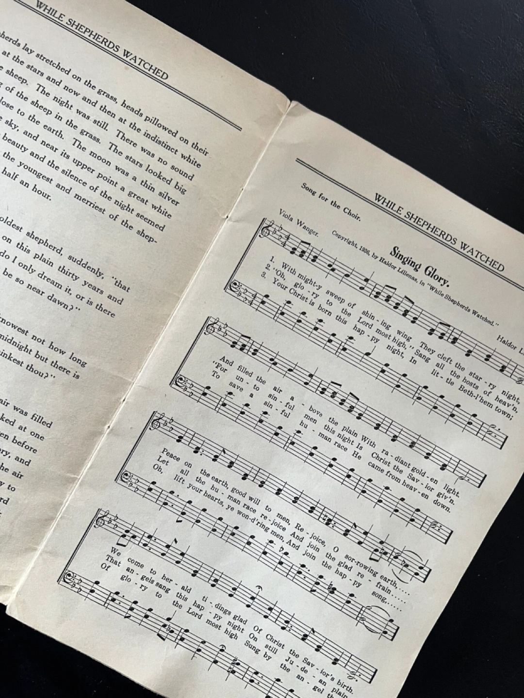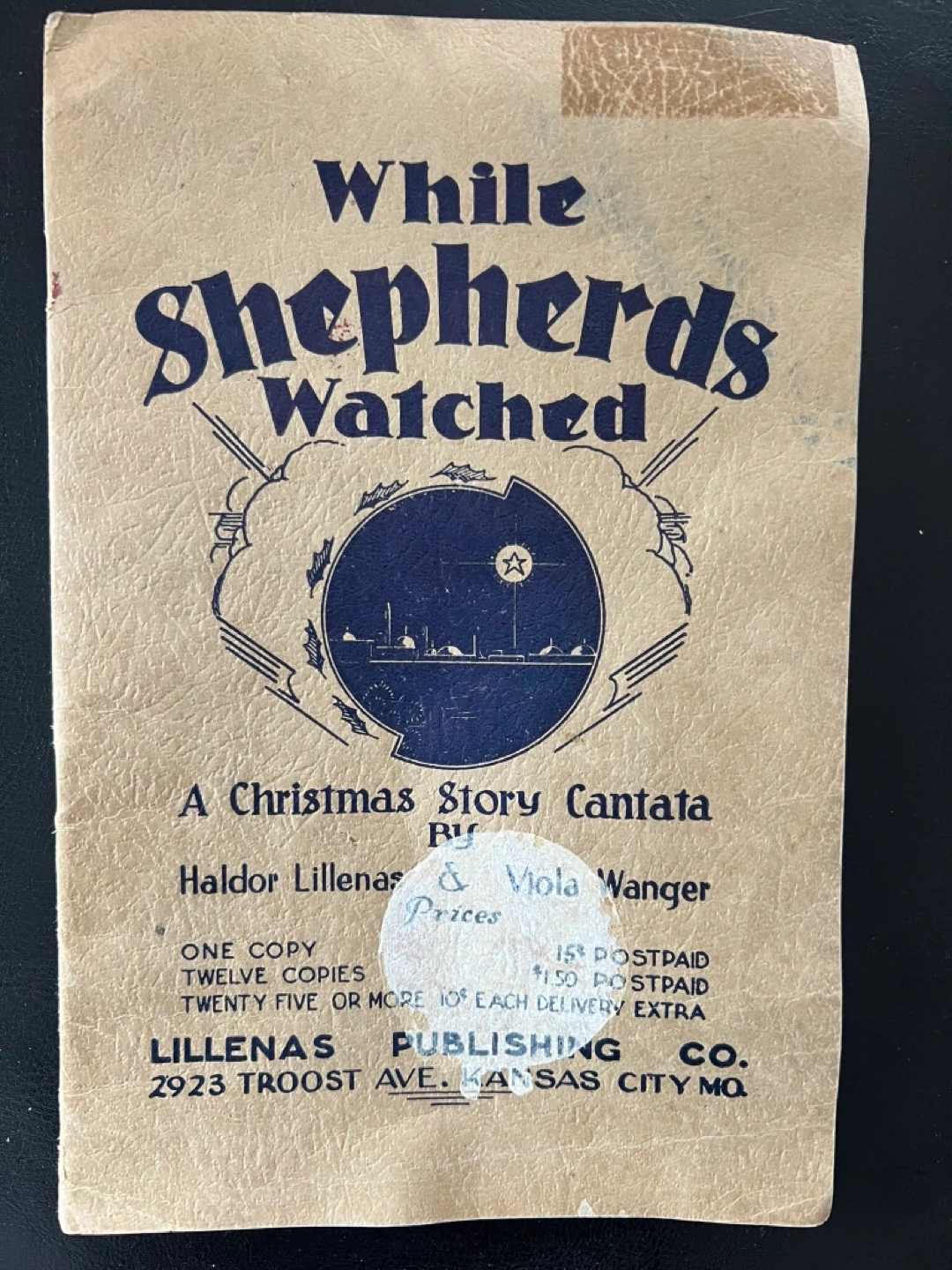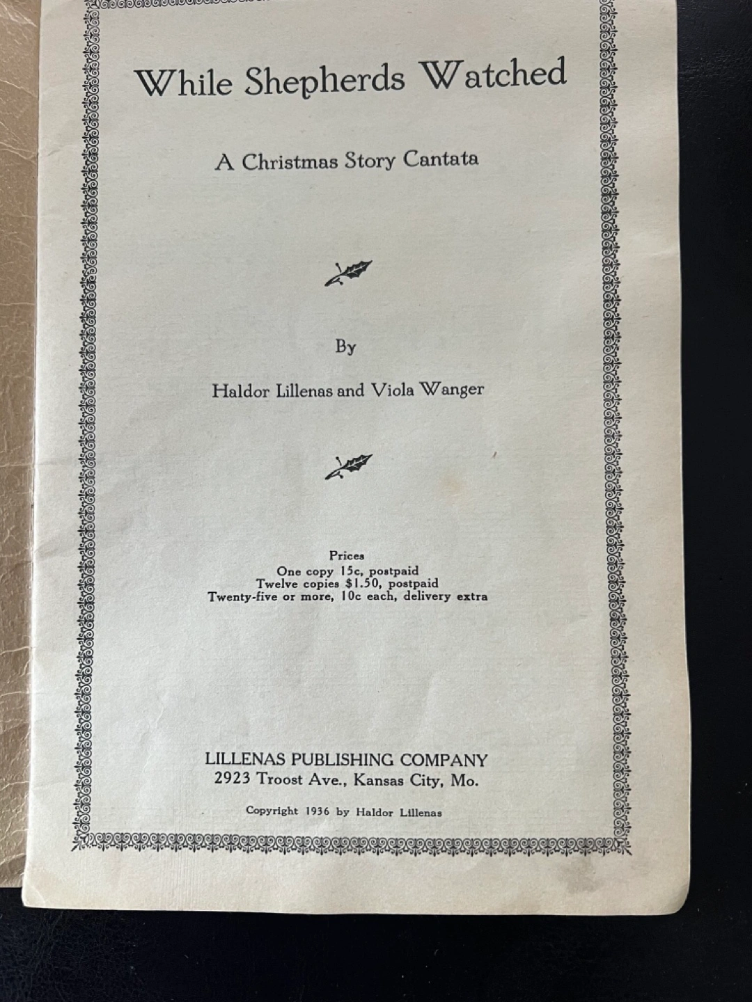 A Christmas story cantata by Halder Lillenas and Viola Wanger. Published by Lillenas Publishing Company, 2923 Troost Ave. Kansas City, MO. Published in 1936.