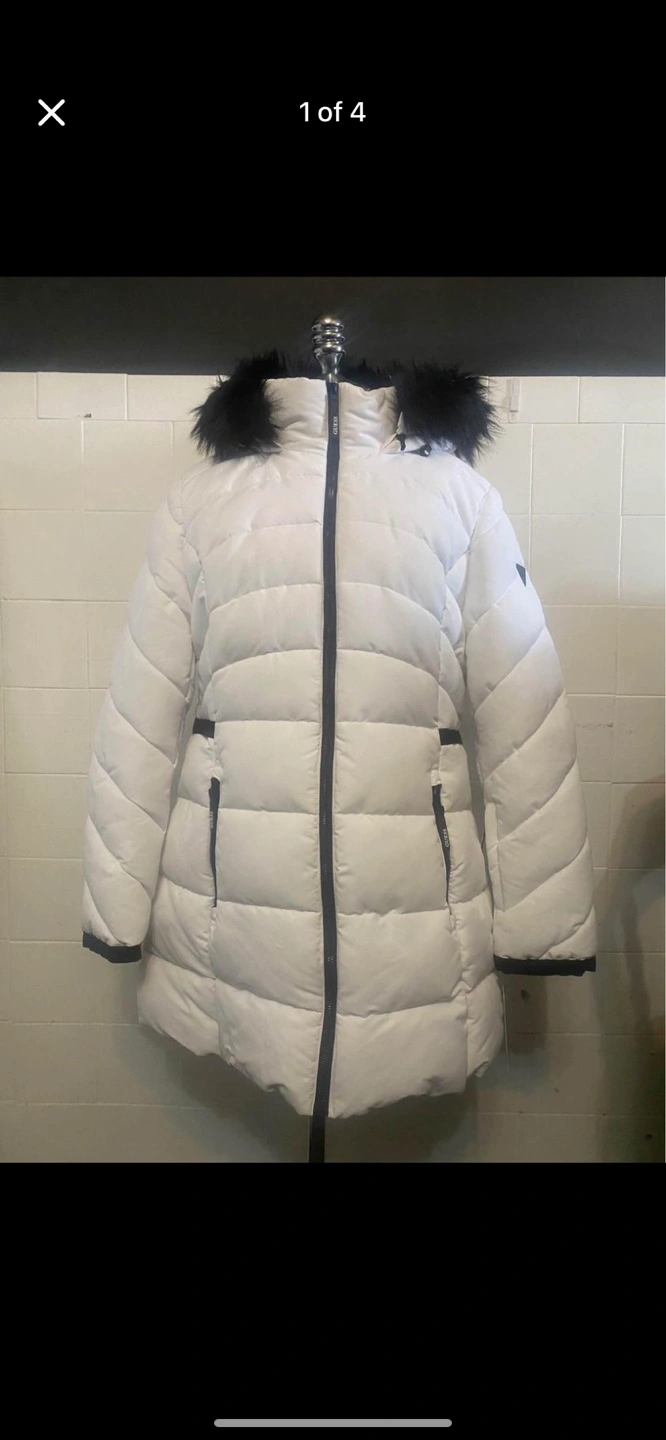 White puffer jacket with black trim and faux fur hood. Features a belt and multiple pockets. Size XL fits like a medium Never worn