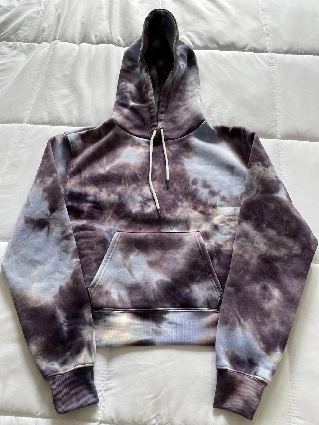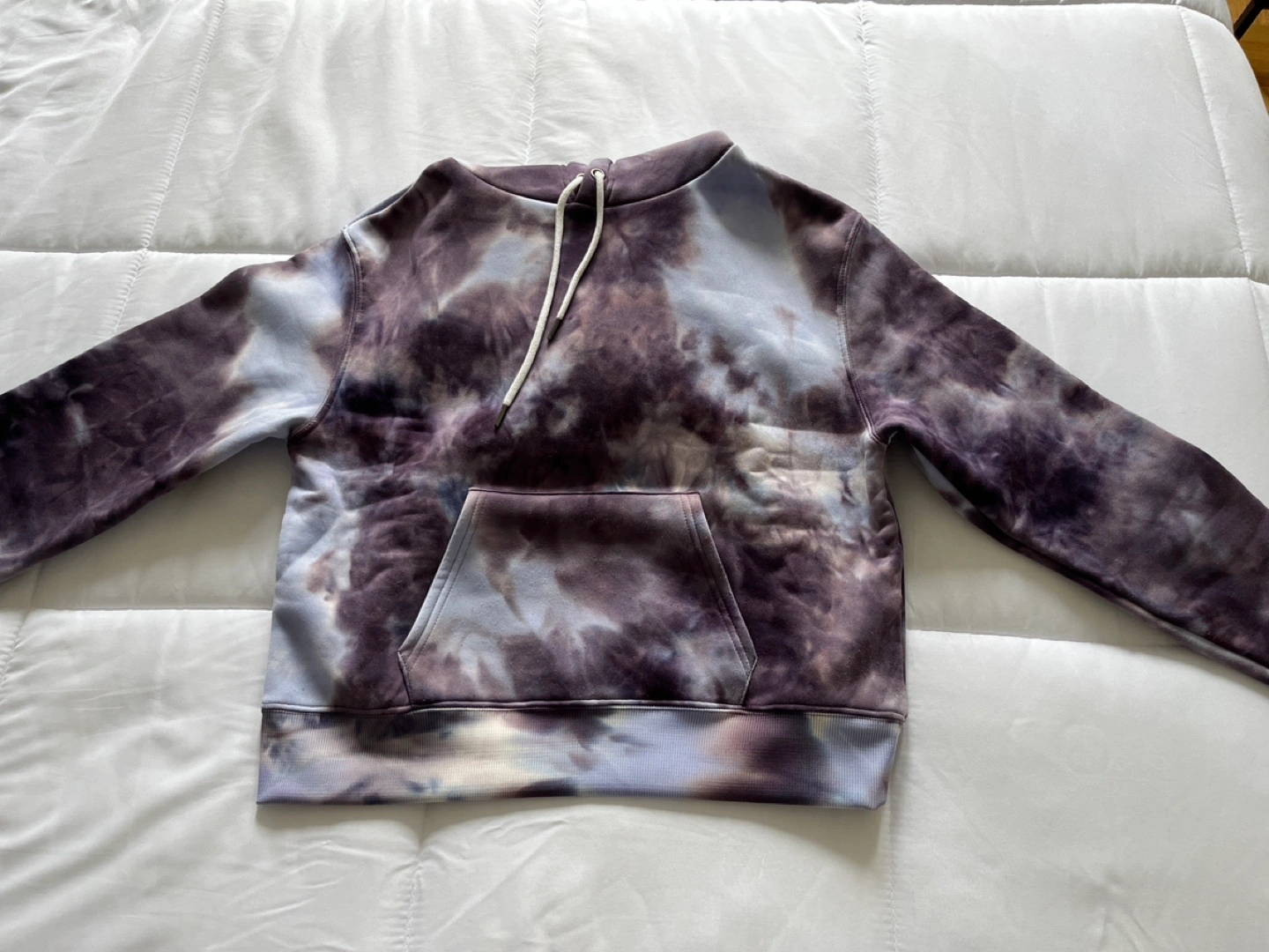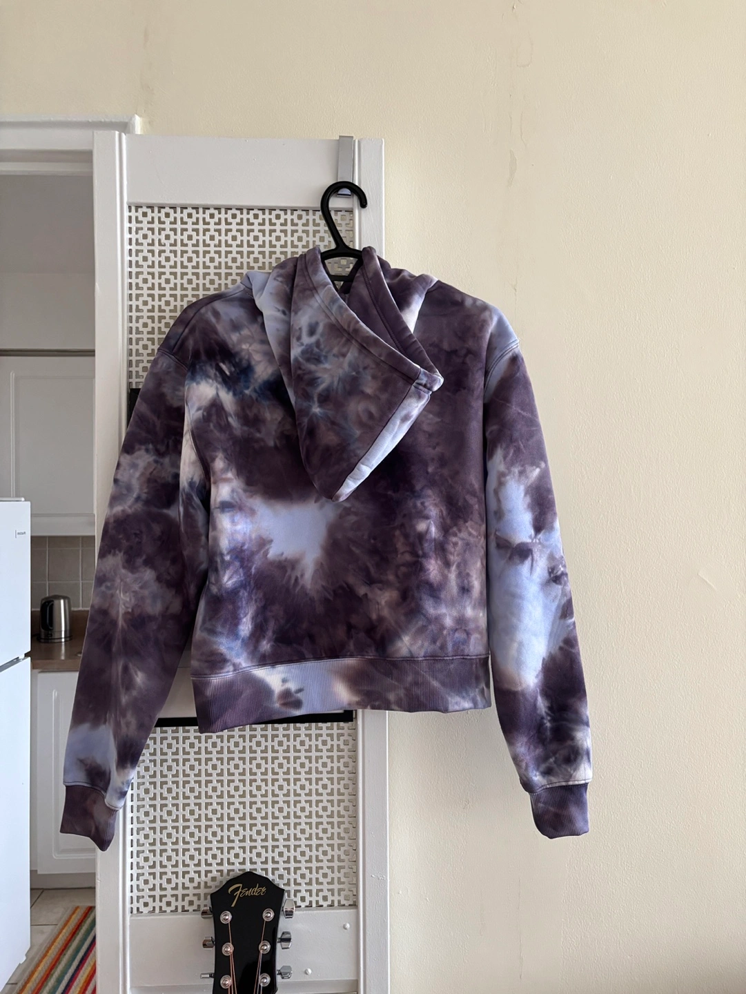 Blue and purple tie dye hoodie with a front pocket. Long sleeves and a white drawstrings. Practically brand-new. Warm & comfy! Cash only. Pick up at RBC Bathurst and Sheppard or see my bio for other location options! I’m available to answer any questions :)