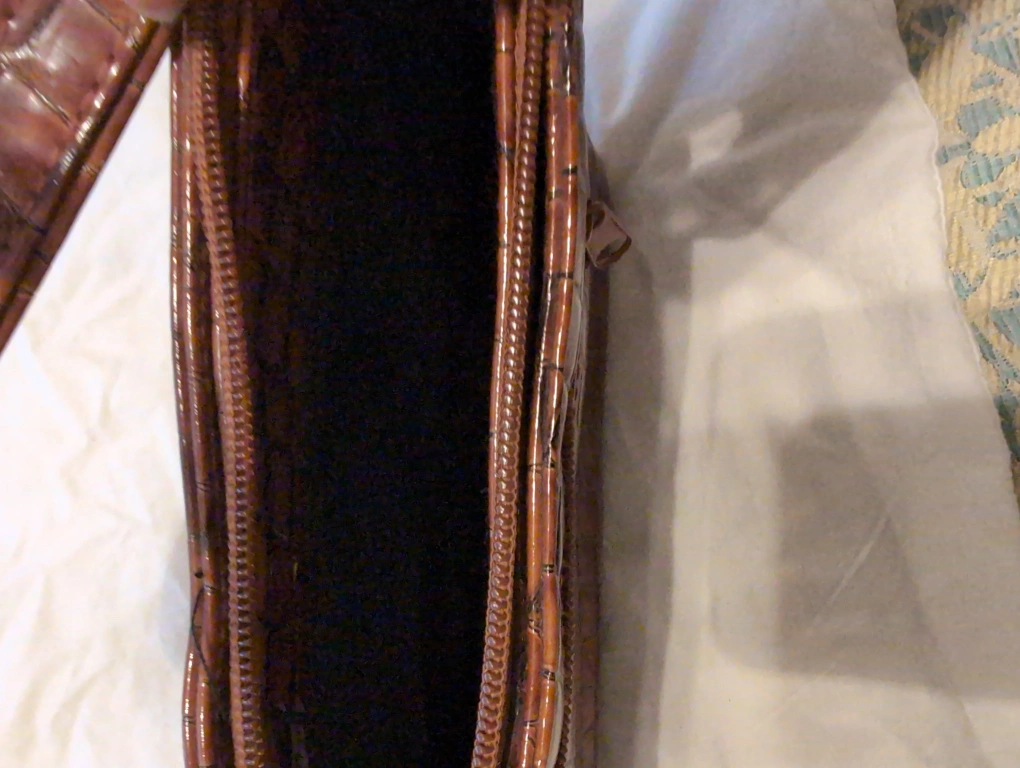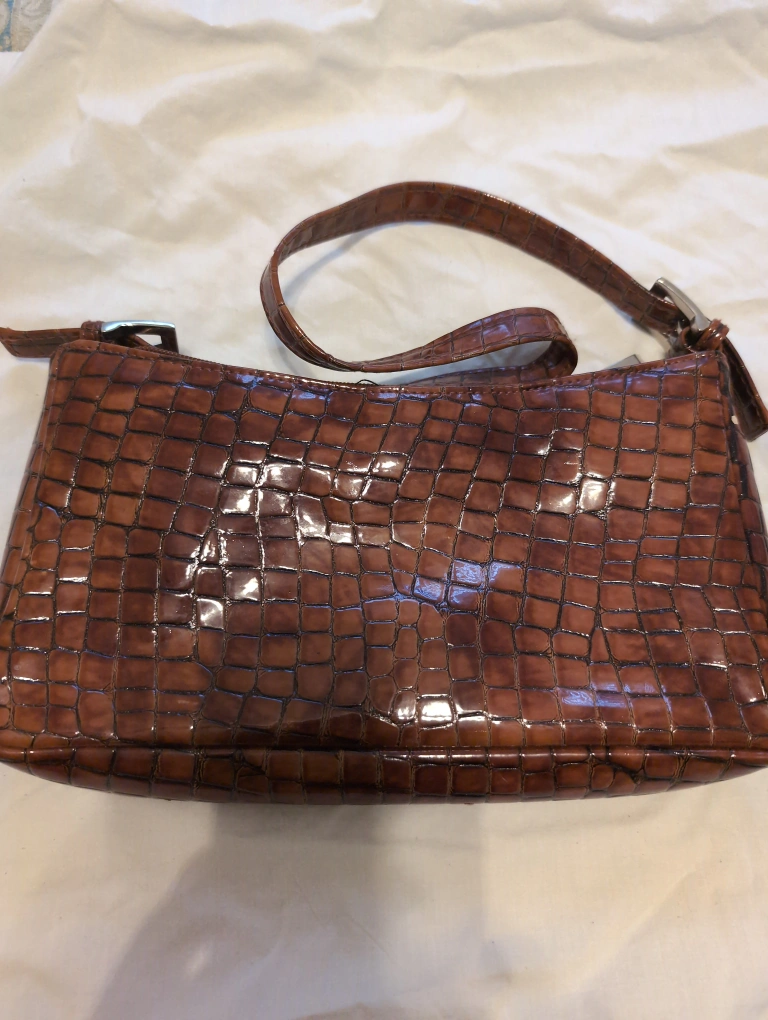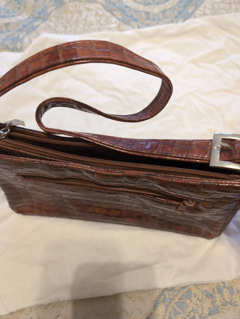 Small brown purse with a crocodile-embossed design. Features a long strap and two zippered compartments.