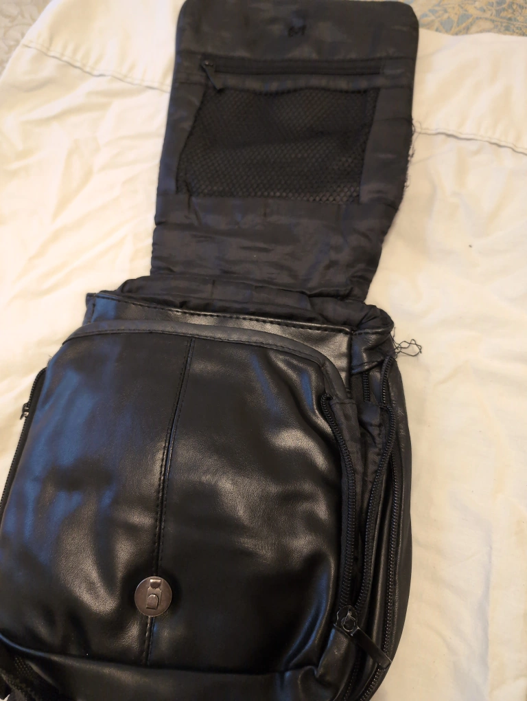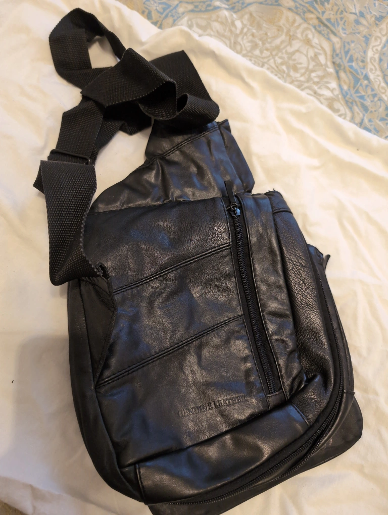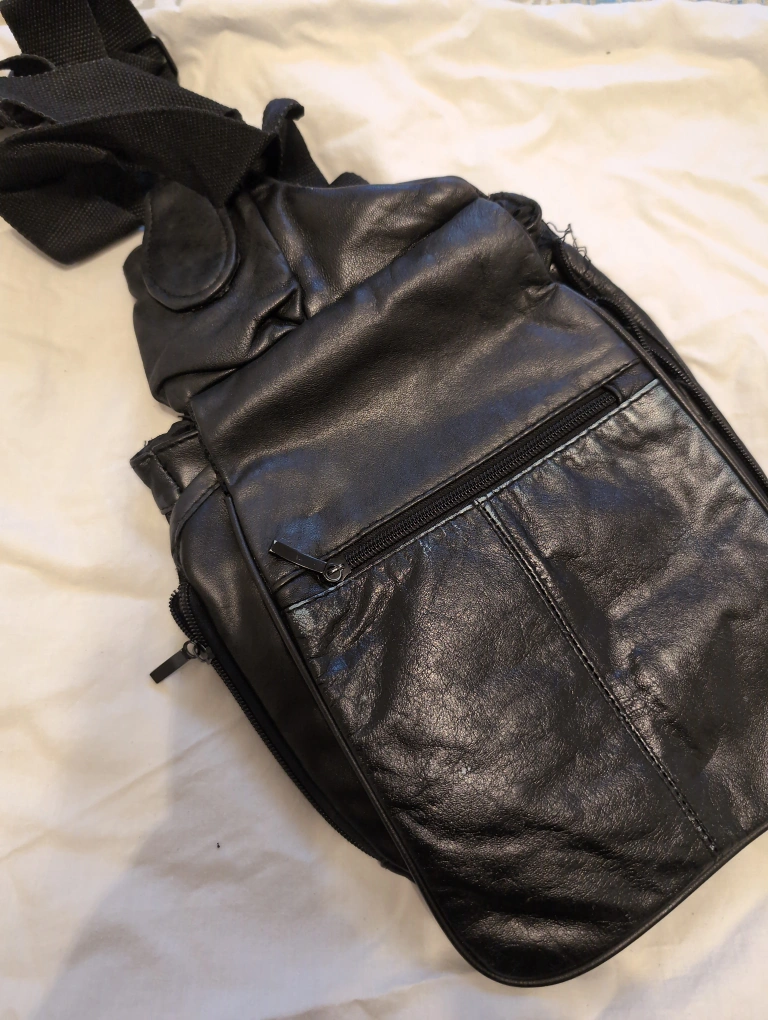 Black leather crossbody bag with multiple zippered compartments. Adjustable strap.
