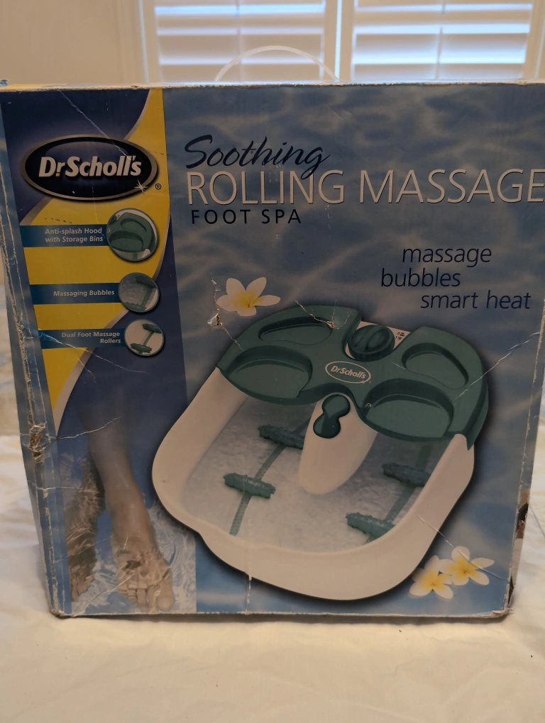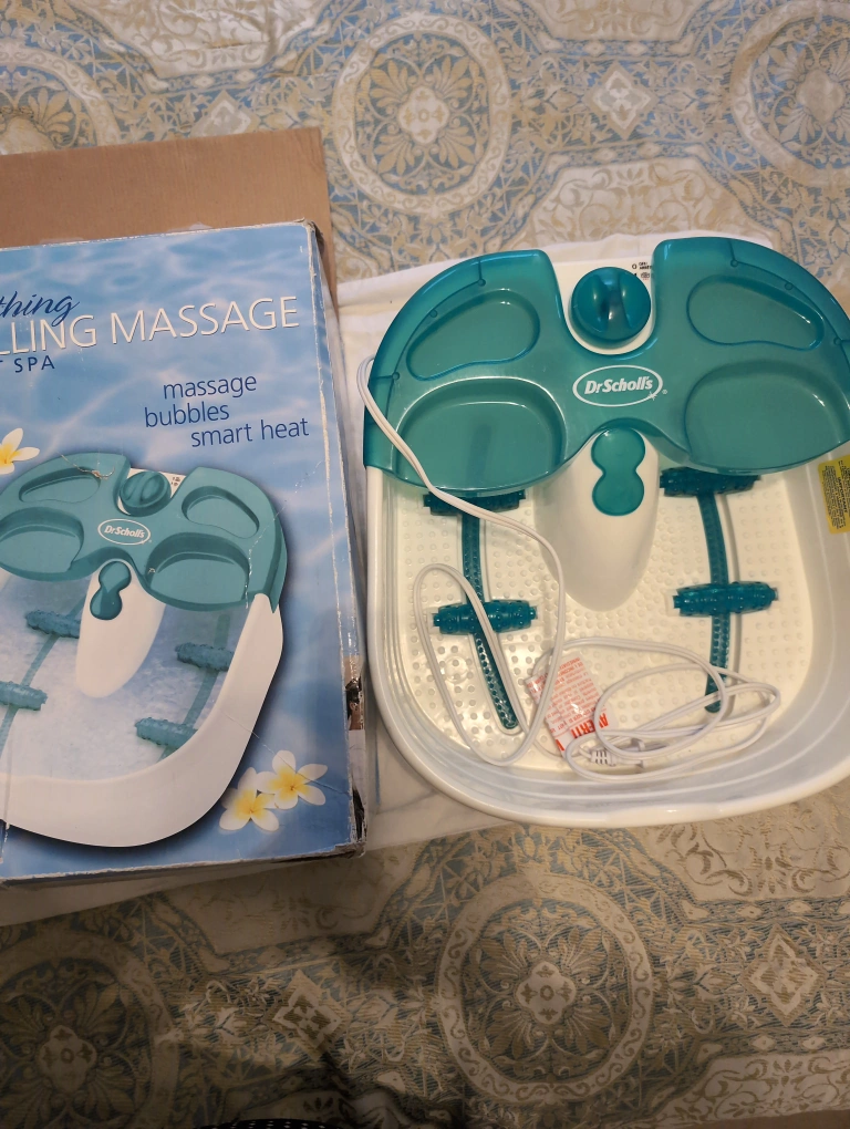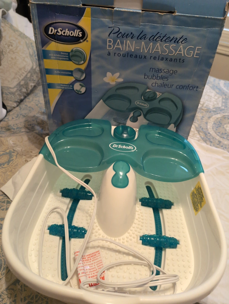 Foot spa with massage bubbles and smart heat. Includes anti-splash hood with storage tray and dual foot massage rollers.