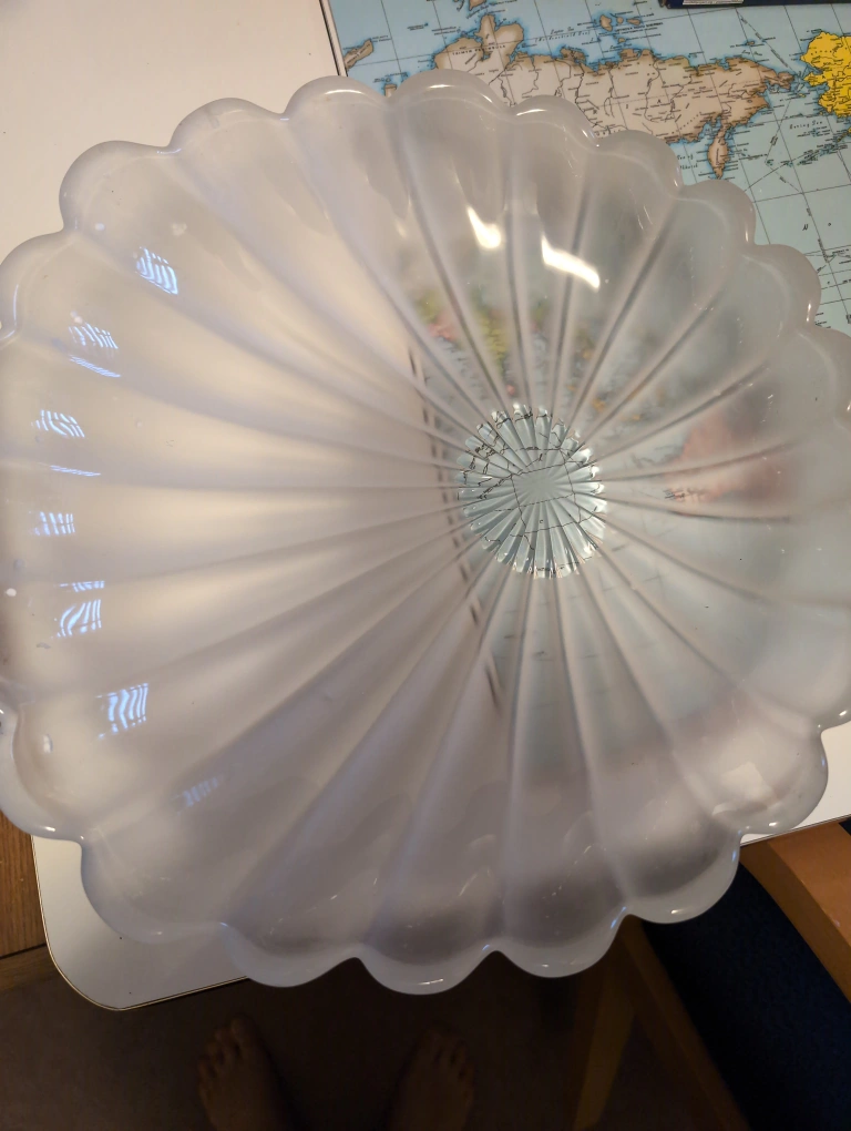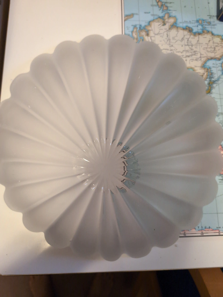Frosted glass serving bowl, scalloped edges. Measures approximately 10 inches in diameter.