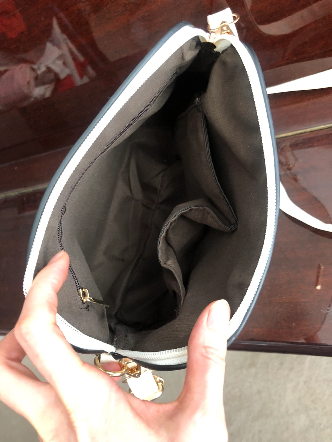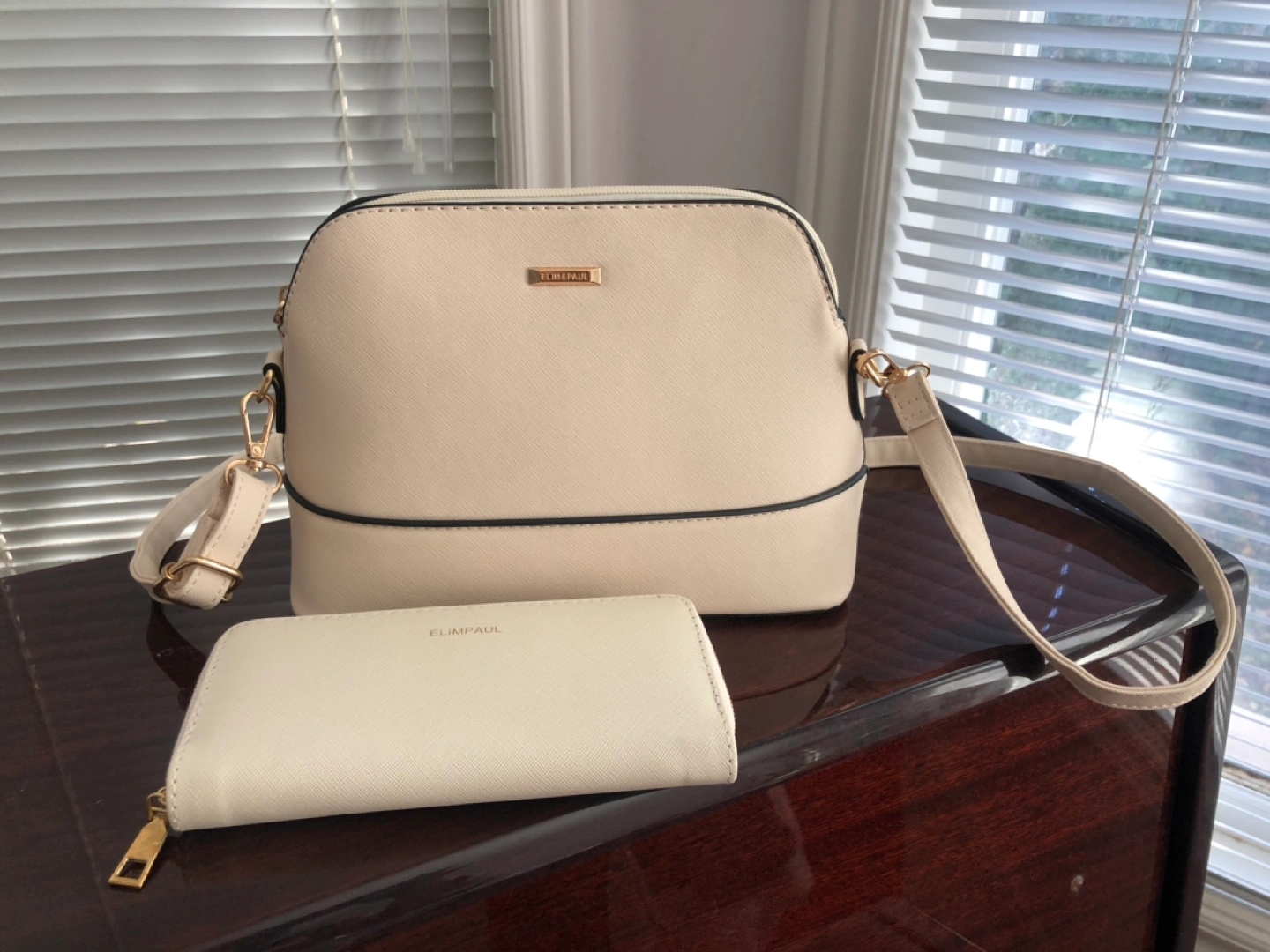 Cream-colored crossbody purse with a free matching wallet. The purse has a zipper closure and a long adjustable strap. The wallet has a zipper closure and several card slots. They’re brand new, never be used. Gifted to me, but not my style.