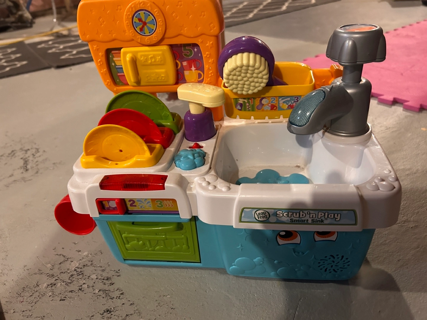 Interactive toy sink with water play features. Includes a variety of interactive elements, like spinning plates and a faucet.