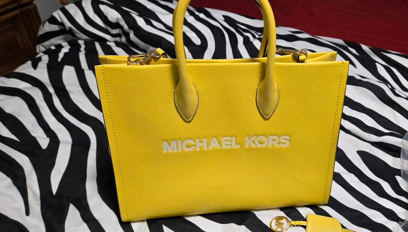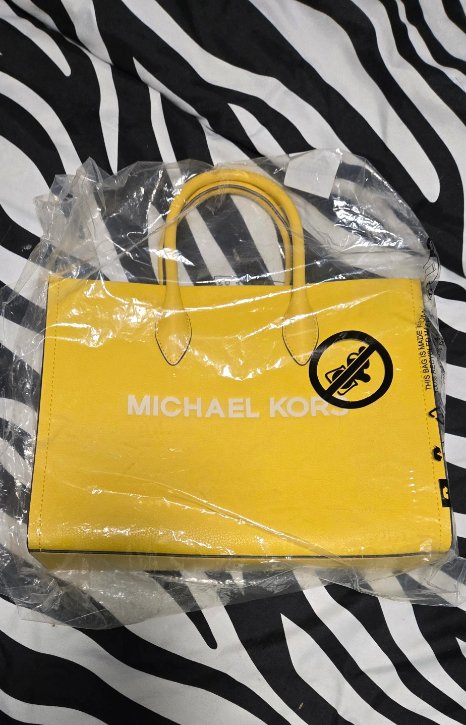 Yellow leather tote bag with gold hardware. Removable shoulder strap.