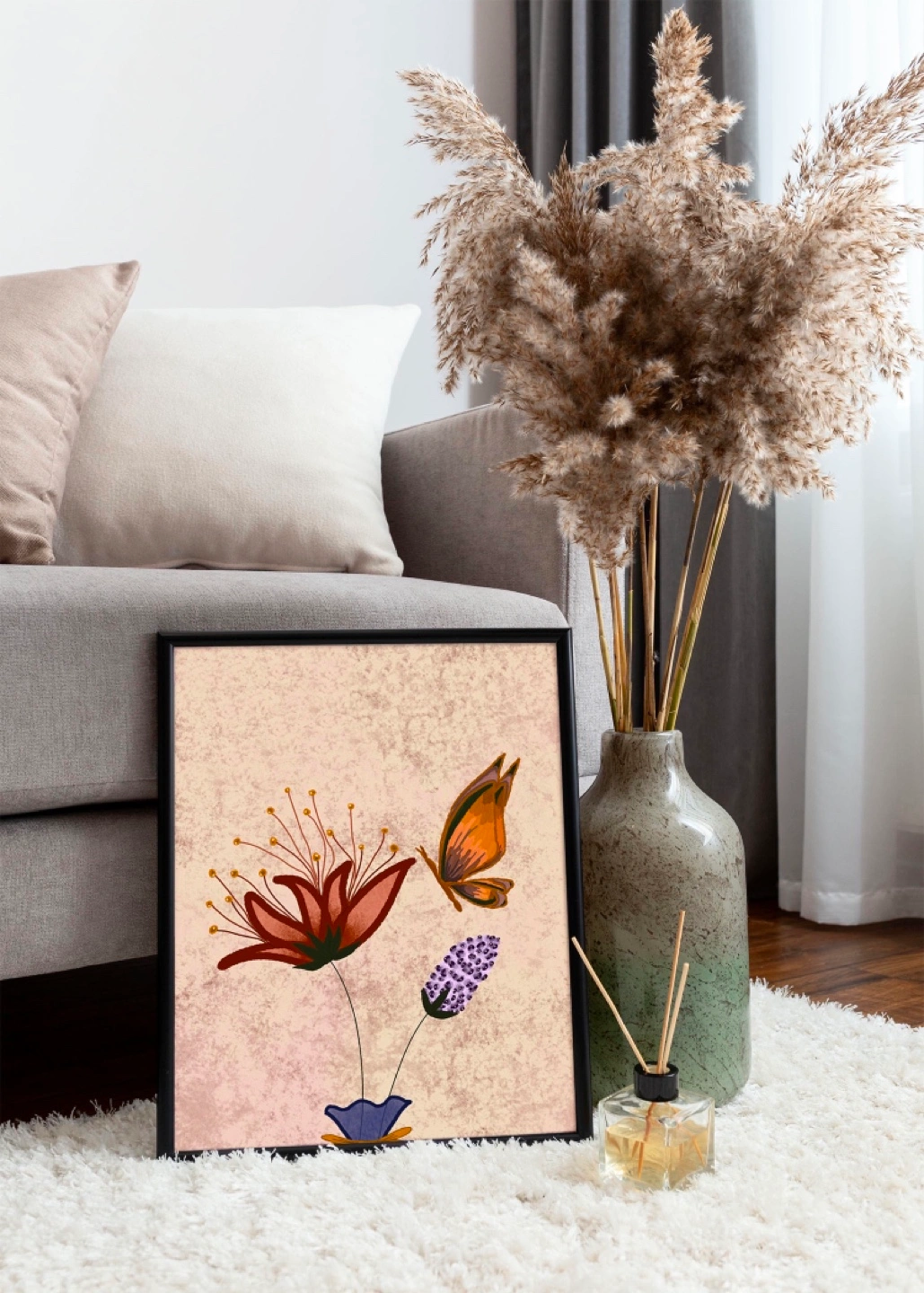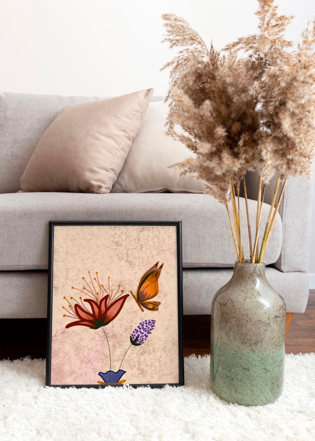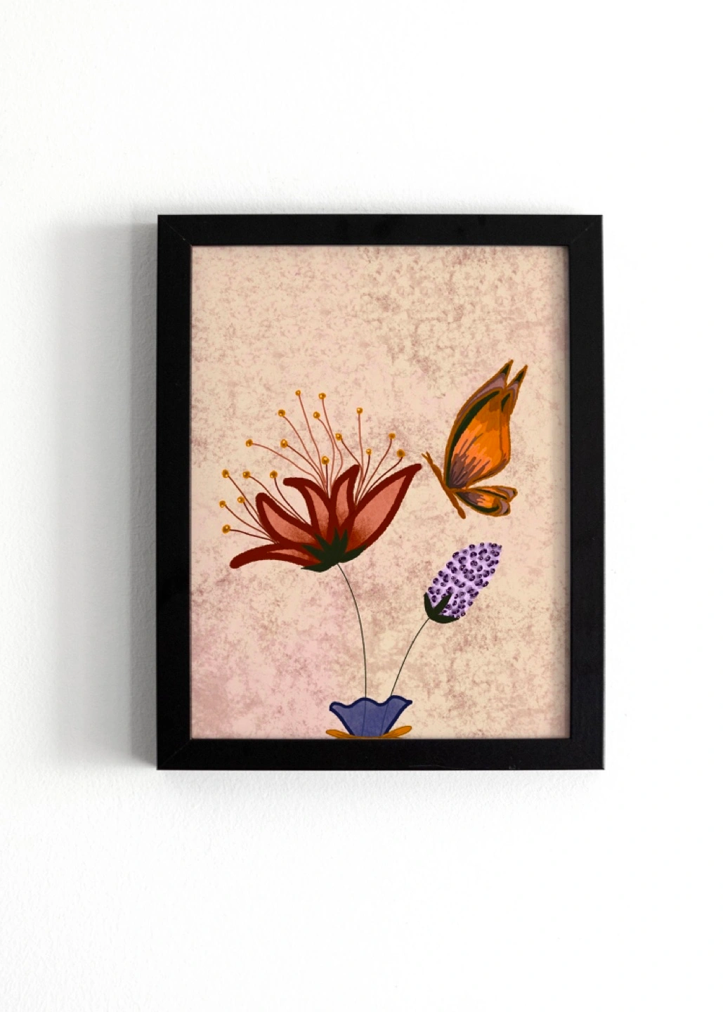 Framed print featuring a floral design with a butterfly. This charming print is like none you’ve ever seen- comes fully framed with Black frame. Sized 11 in x 14 in