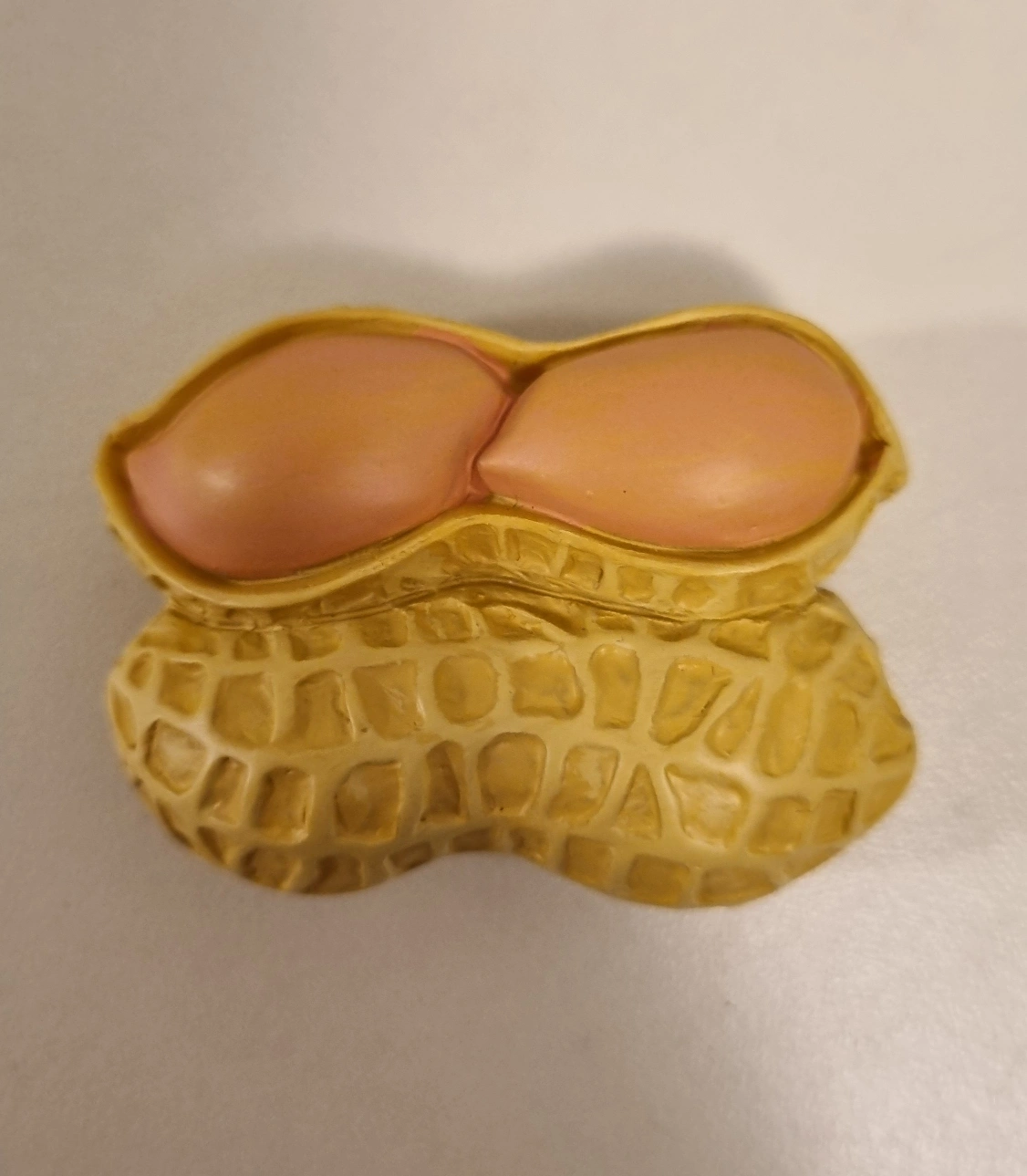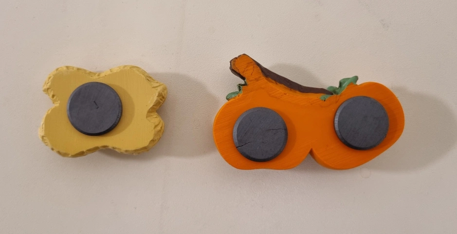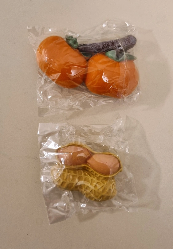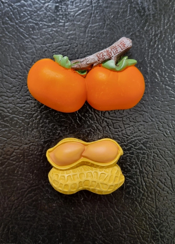 fridge magnets.persimmons, and peanut. The persimmons have a small brown stick with writing on it. The peanut is open and shows the two peanuts inside. each: $5