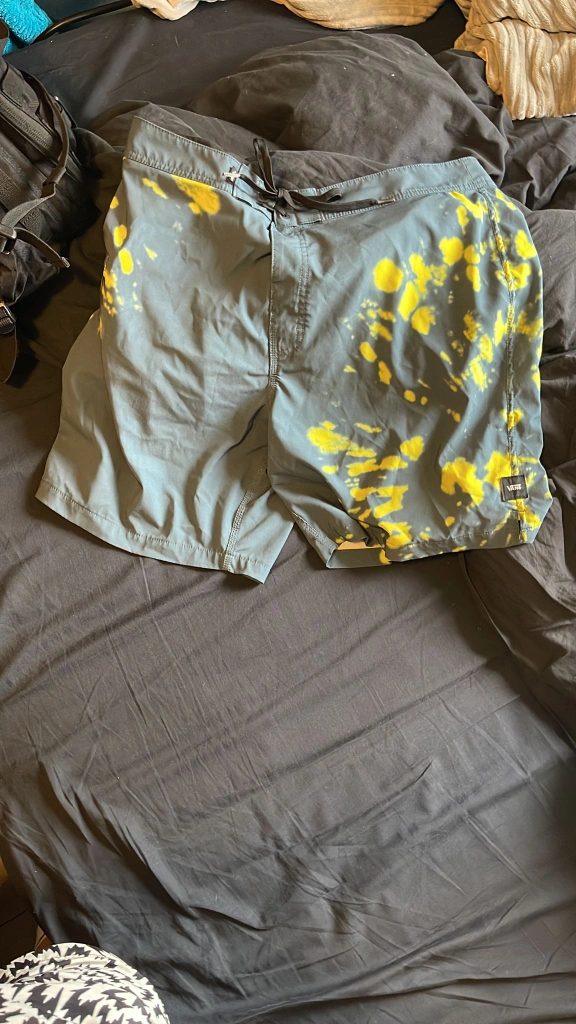 Blue and yellow tie dye board shorts. Drawstring waist. free to a good home hopefully win a gift card #freecycle