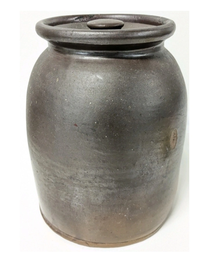 Old earthenware crock with lid, approximately 8 inches tall. 100+ years old no cracks full of unsurched pennies