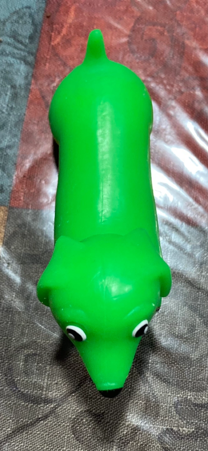 Green rubber dog toy. Squishy. Has black eyes and nose.
