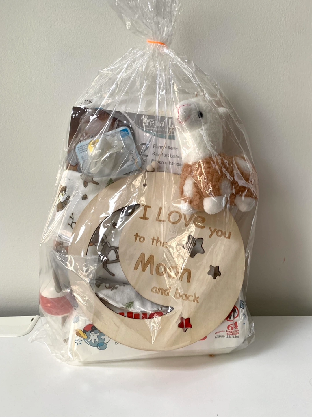 Includes: -Trend Lab 2 reversible flannel bibs -Love You To The Moon and Back sign -Plush lama -Rattle -Peek-a-poo change table liners -wipes -pacifier Great welcome baby gift or baby shower gift