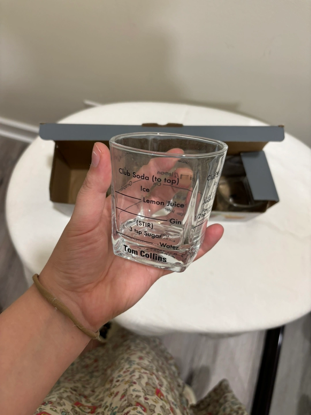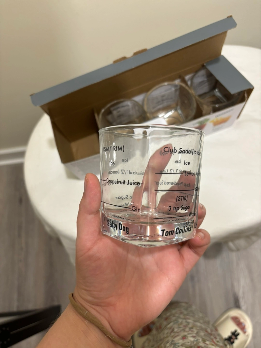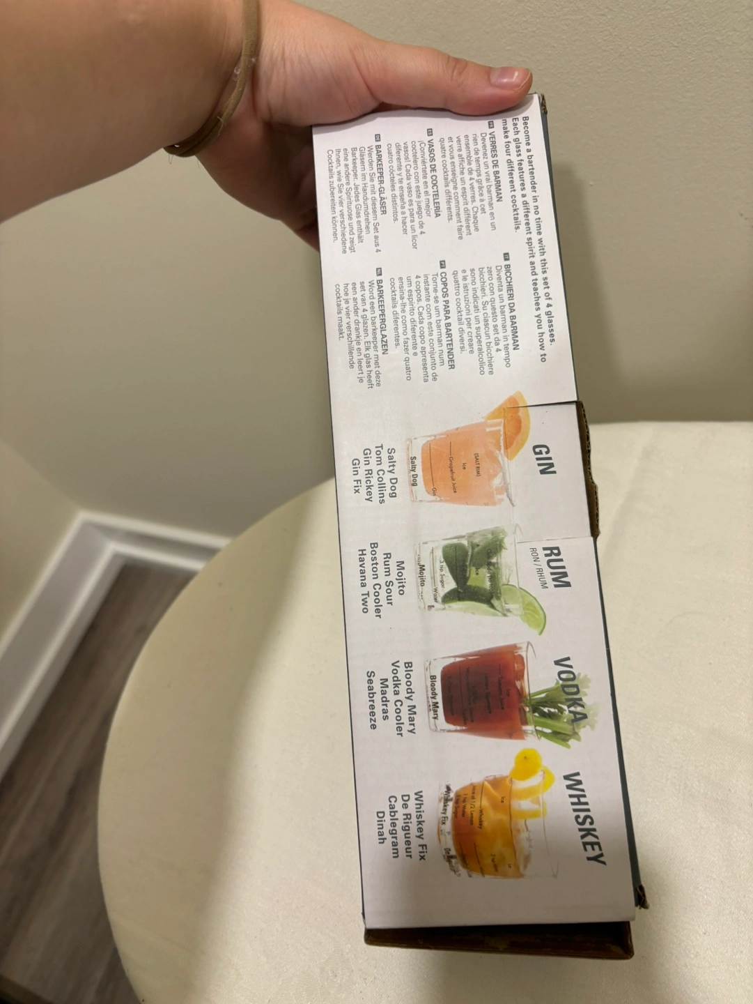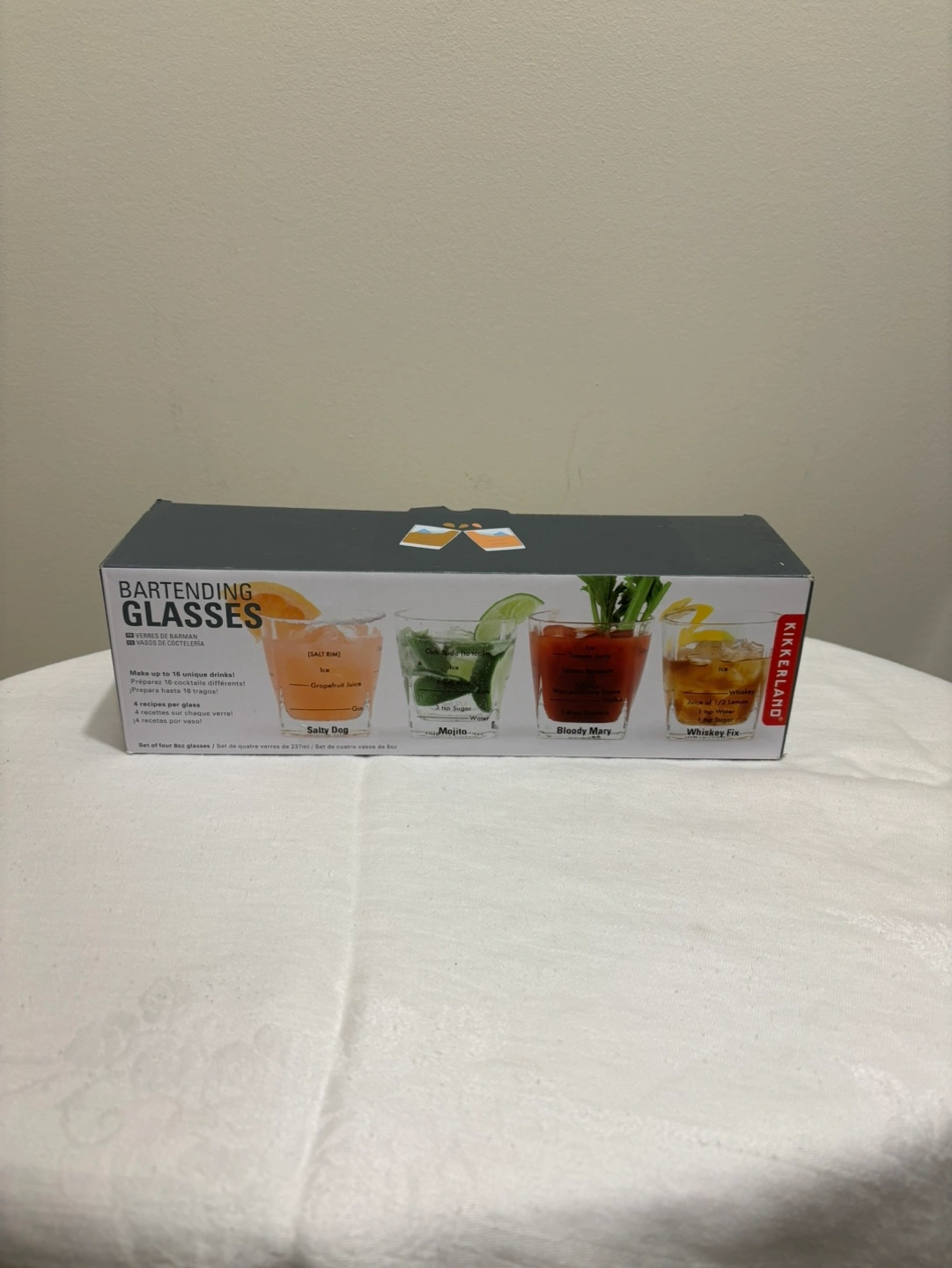 Set of 4 glasses, each marked with measurements for different cocktails. Includes recipes for Salty Dog, Mojito, Bloody Mary and Whiskey Fix. New in box. Good quality. Originally price $30