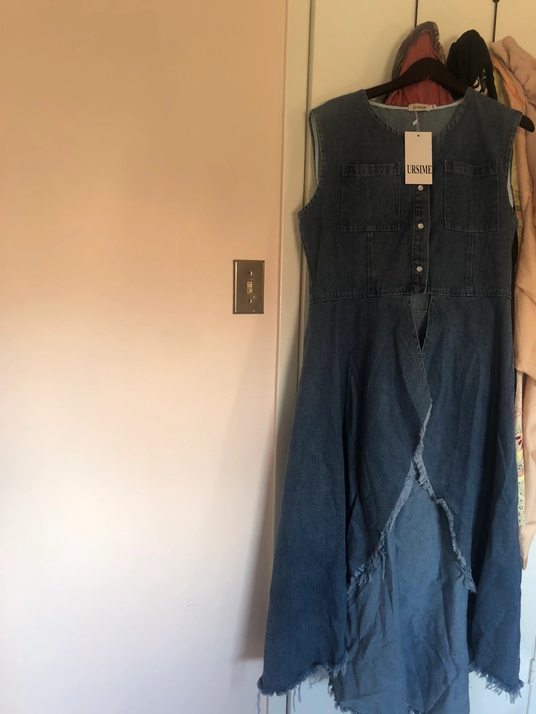 Brand new Blue stretchy denim sleeveless dress with a button up front. It has a high low hem and two pockets. Chest: 22 Waist: 18 Length: 48