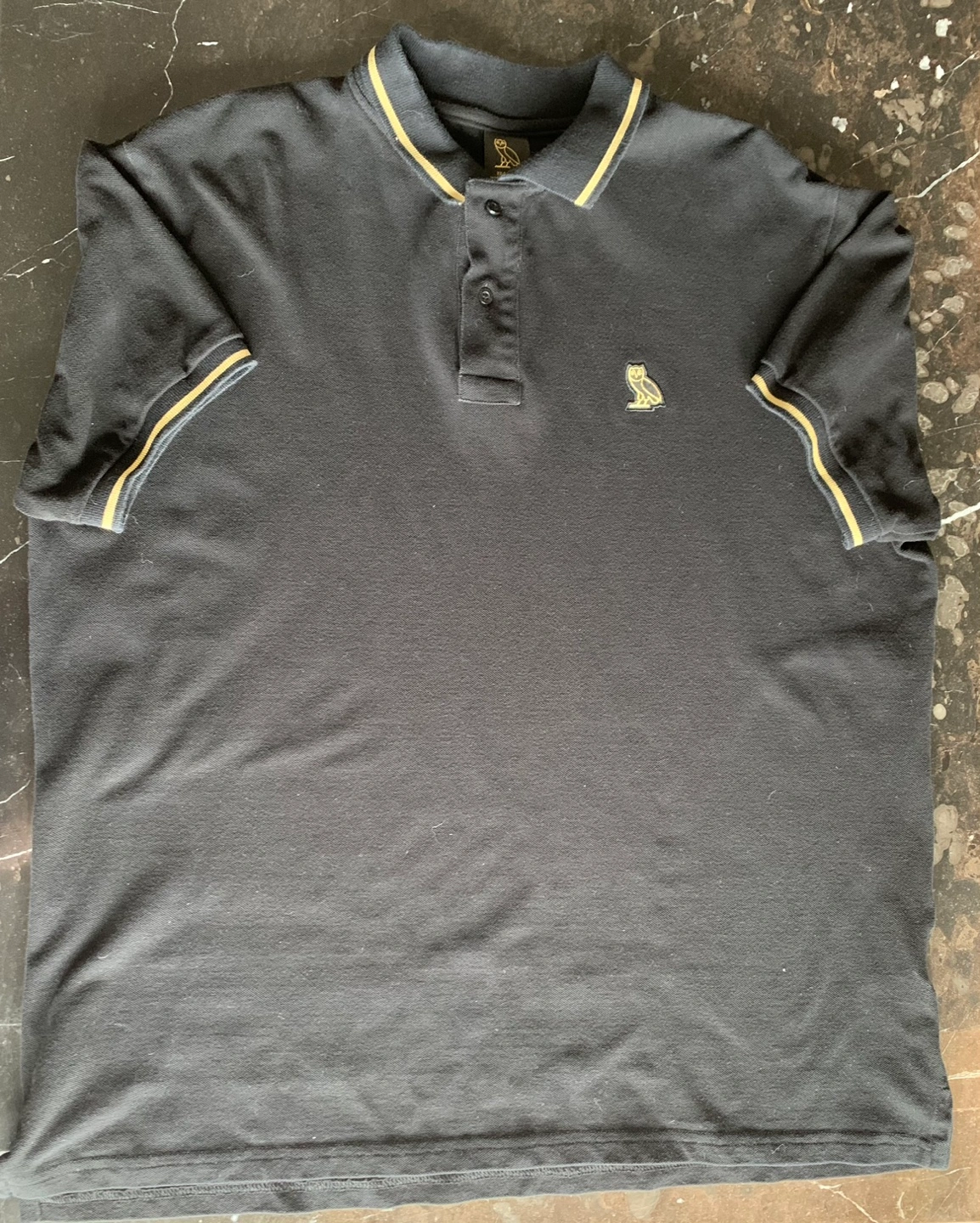 Black polo shirt with gold trim and OVO owl logo. Size: 2XL. Authentic. Lightly worn.