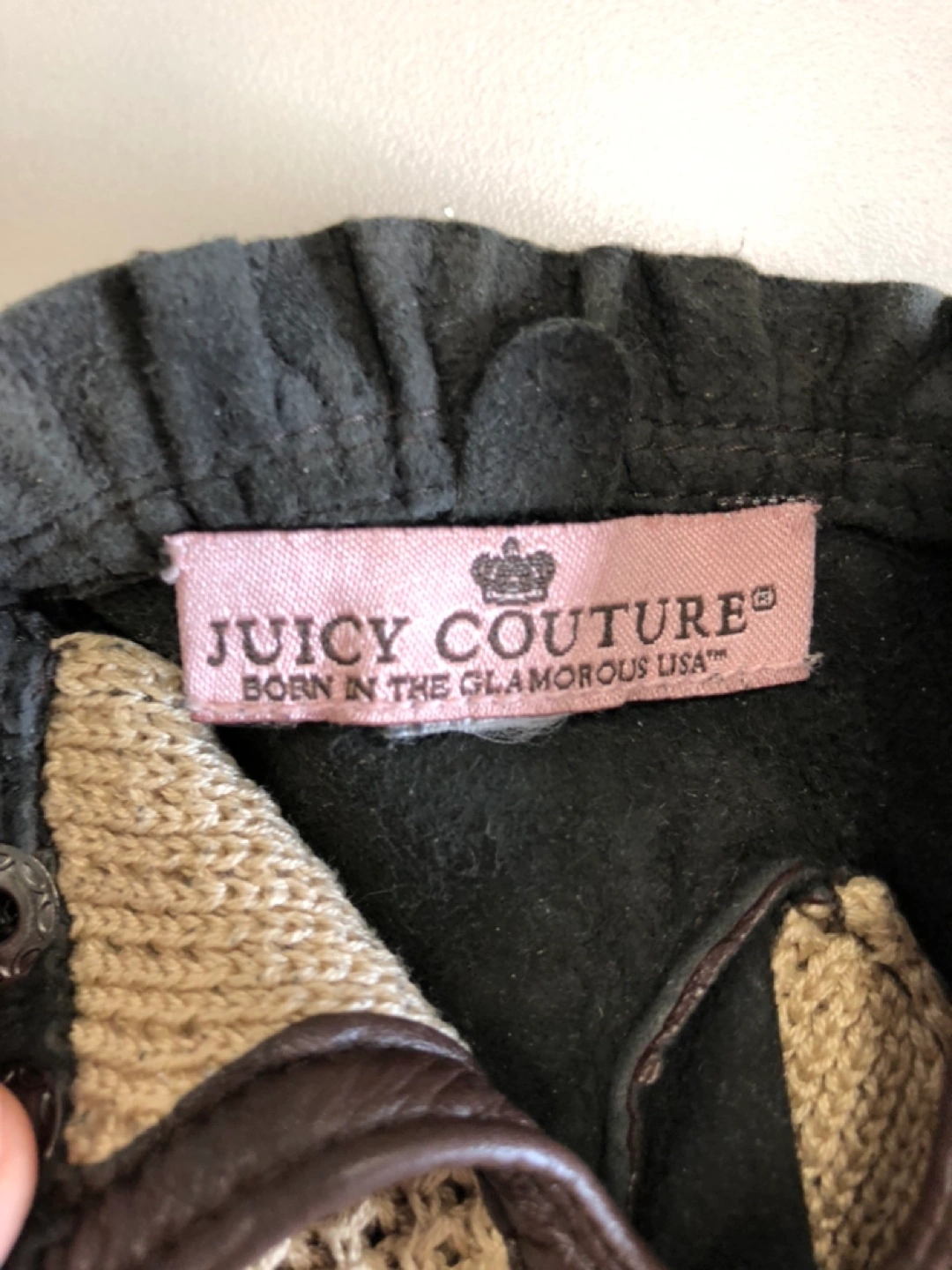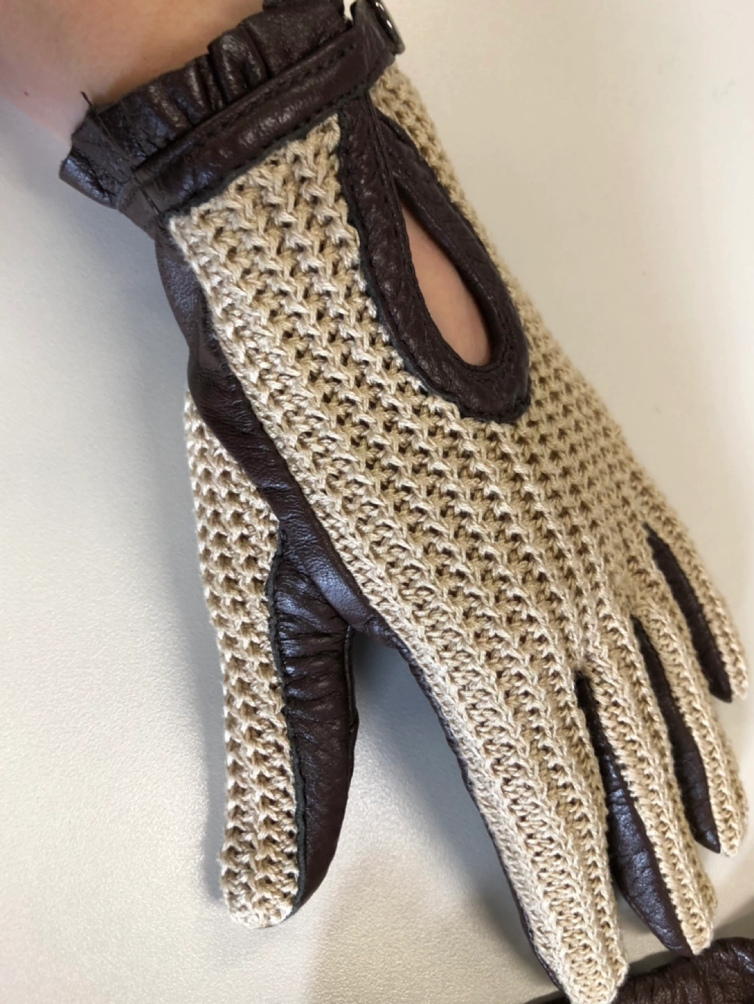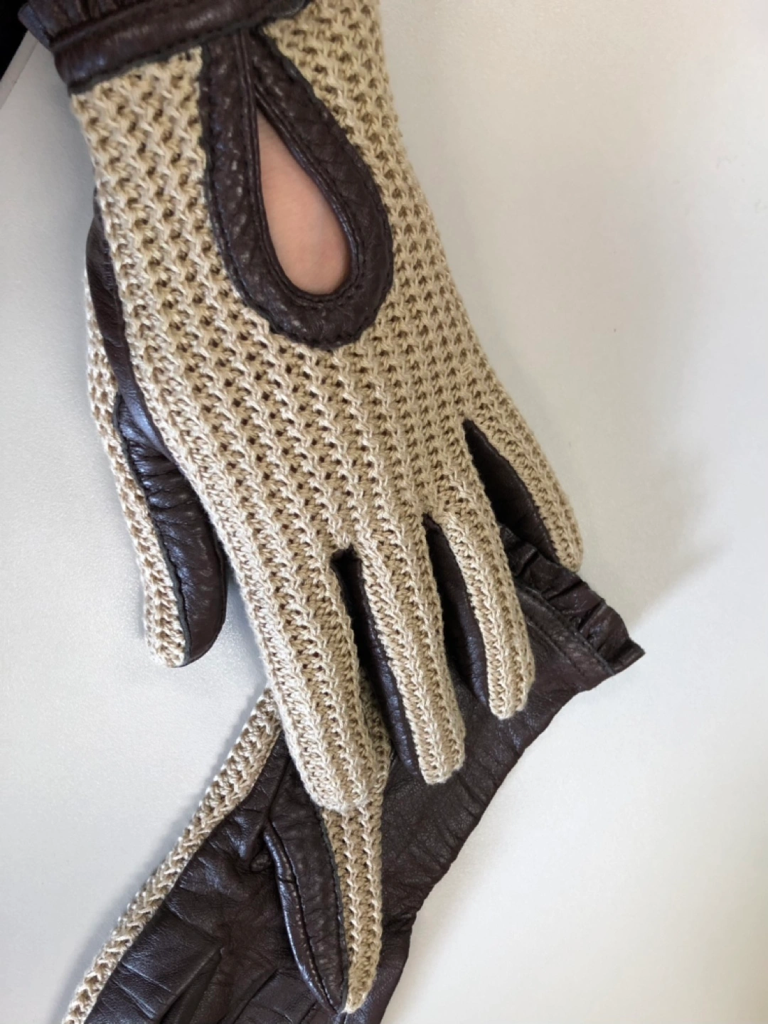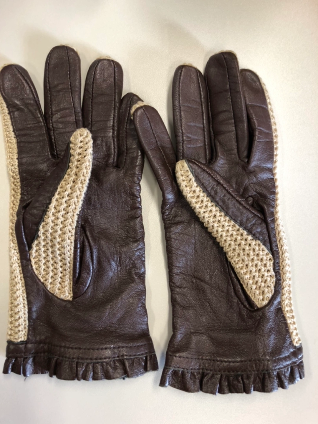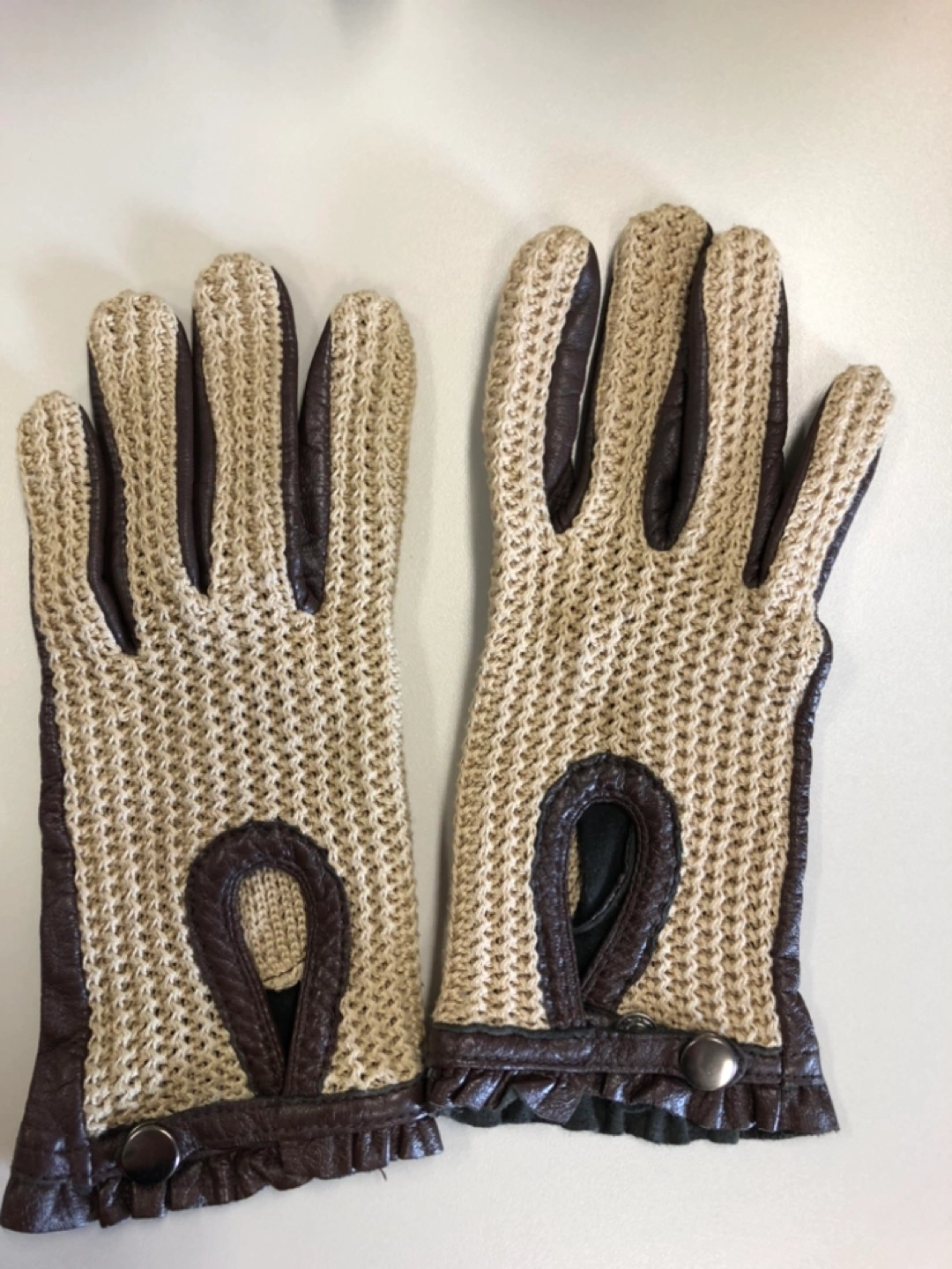 Brown and beige leather driving gloves. Knitted back with leather palm. Ruffle detail around the wrist. Adjustable snap closure at the wrist; keyhole opening on the front. Women’s size small.