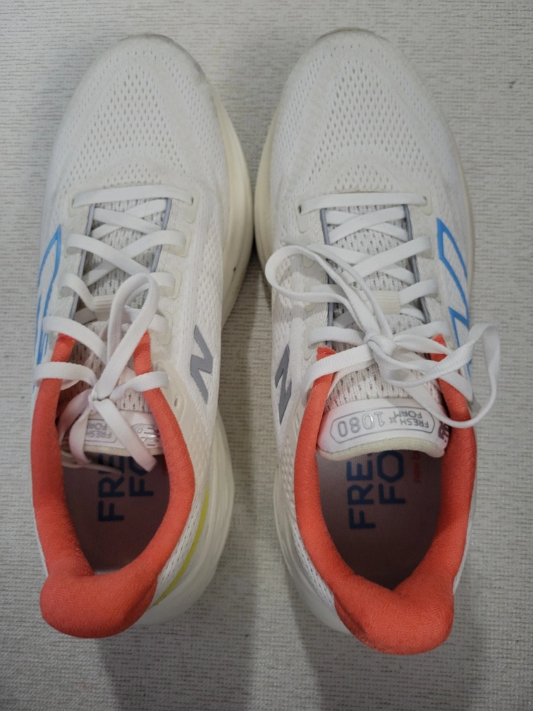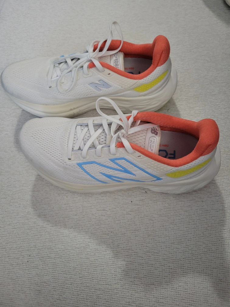 White running shoes with blue and yellow accents. Fresh Foam.