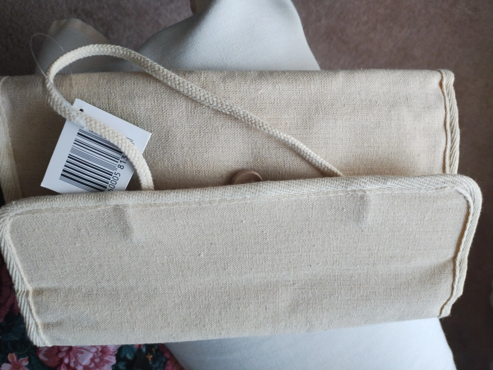 Natural canvas makeup bag with black lining and multiple zippered compartments. Features a button closure and a carrying/hanging handle. Never used soft cotton.