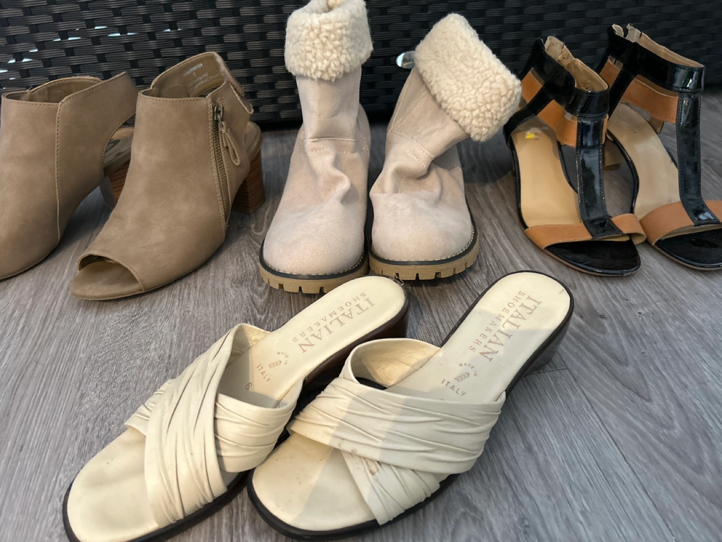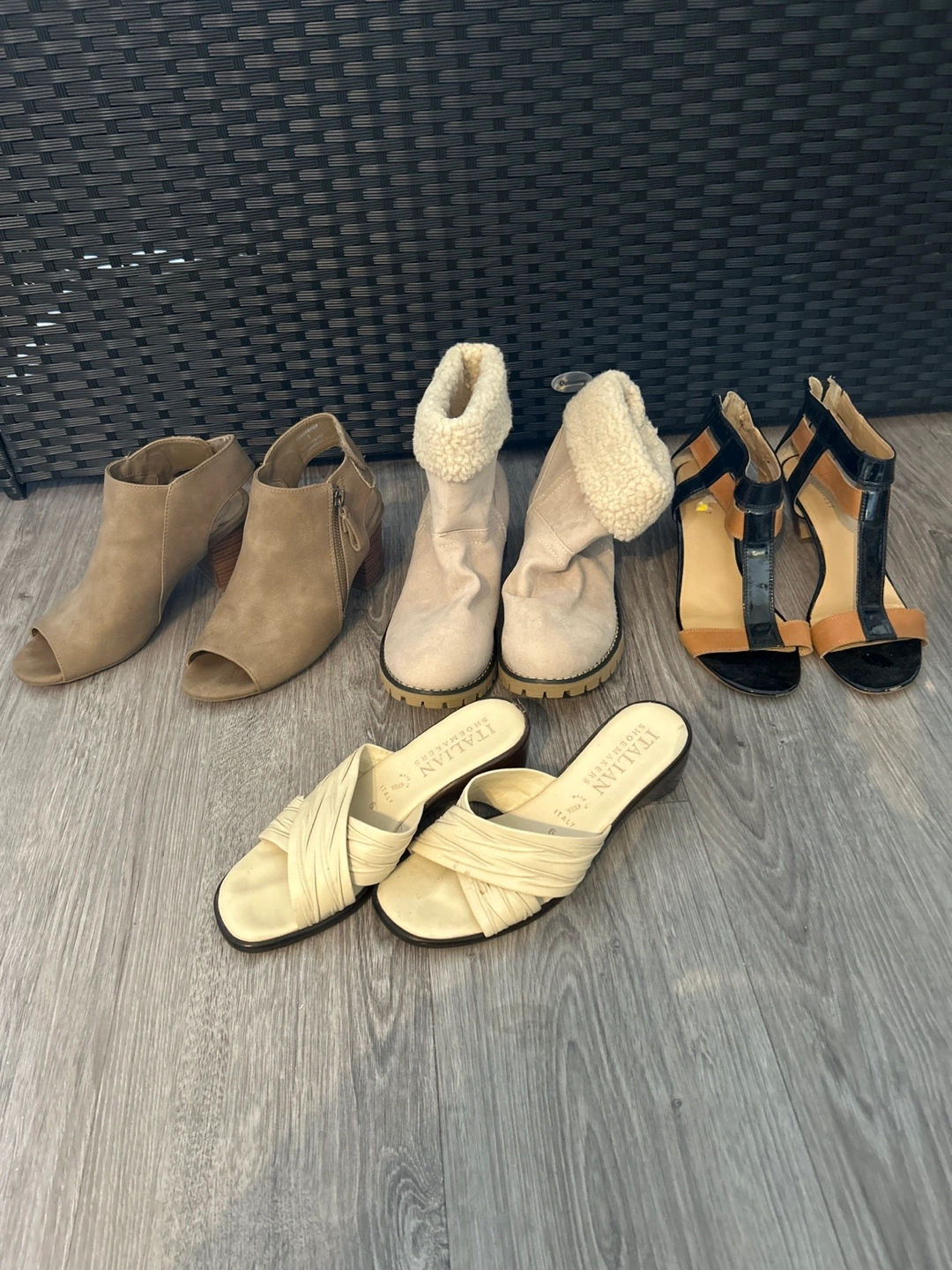 4 pairs of women's shoes in various styles and colours. Includes two pairs of sandals, a pair of ankle boots and a pair of slides. All shoes are in good condition. The boots are brand new and slightly larger to allow heavy socks for winter. All sold as a batch.